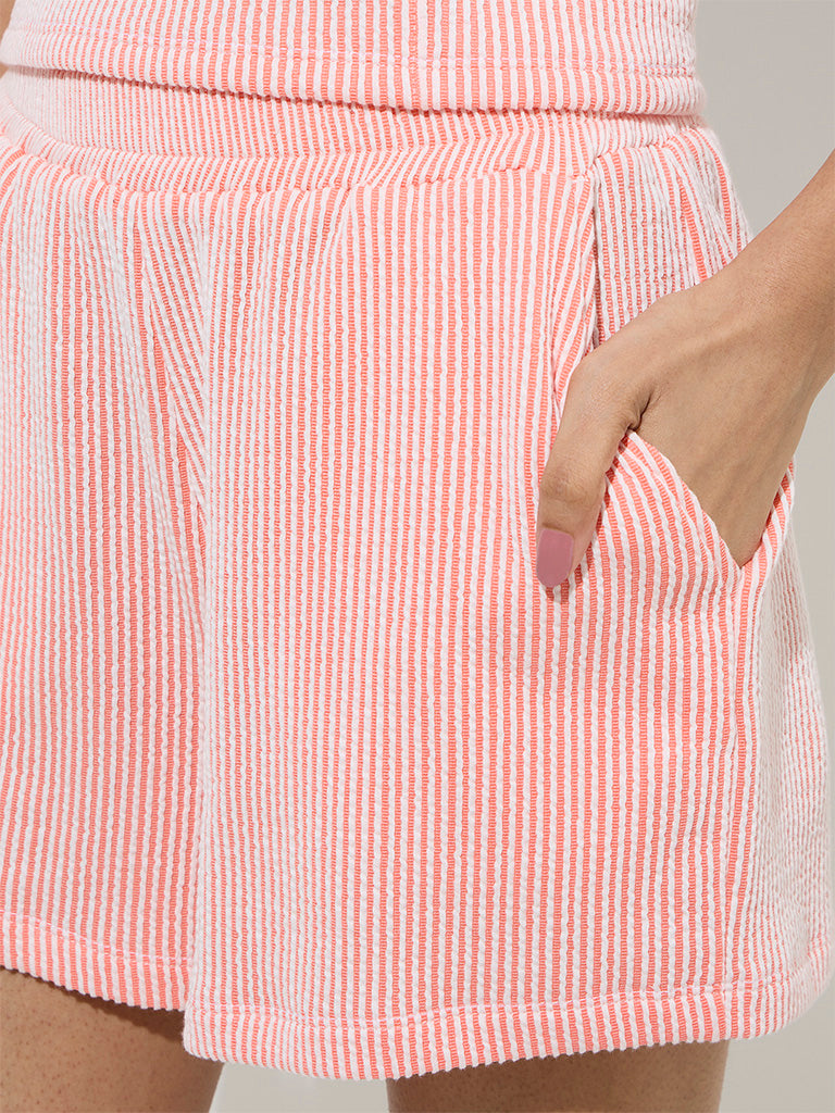 These orange high-rise shorts from Studiofit are crafted from a soft cotton-blend fabric with white textured stripes. Designed for comfort. they feature a smooth elastic waistband and practical side pockets—making them an easy pick for relaxed. everyday wear.