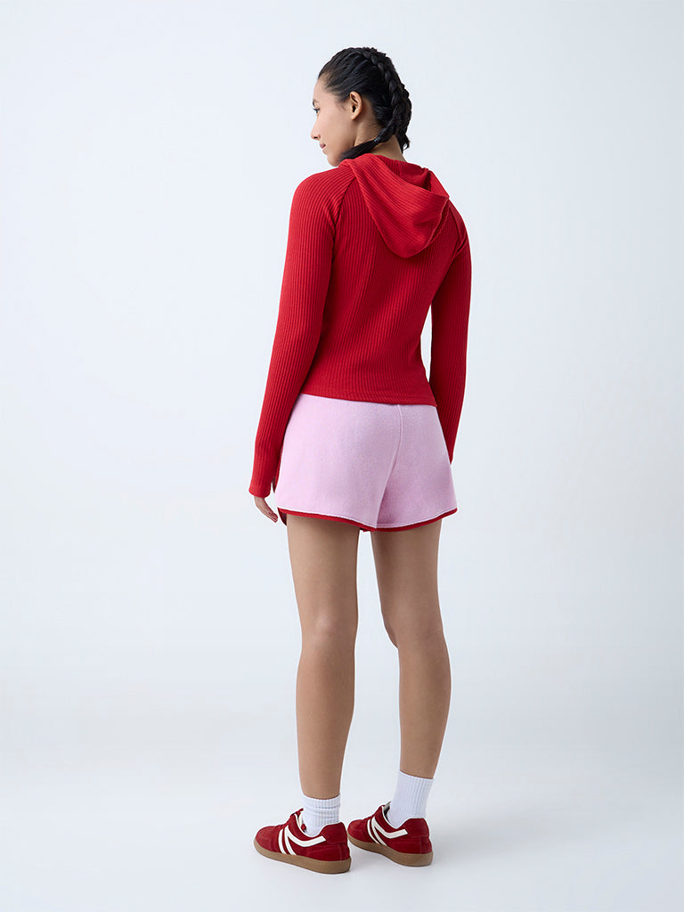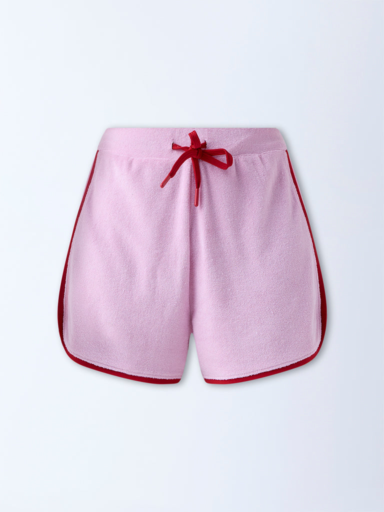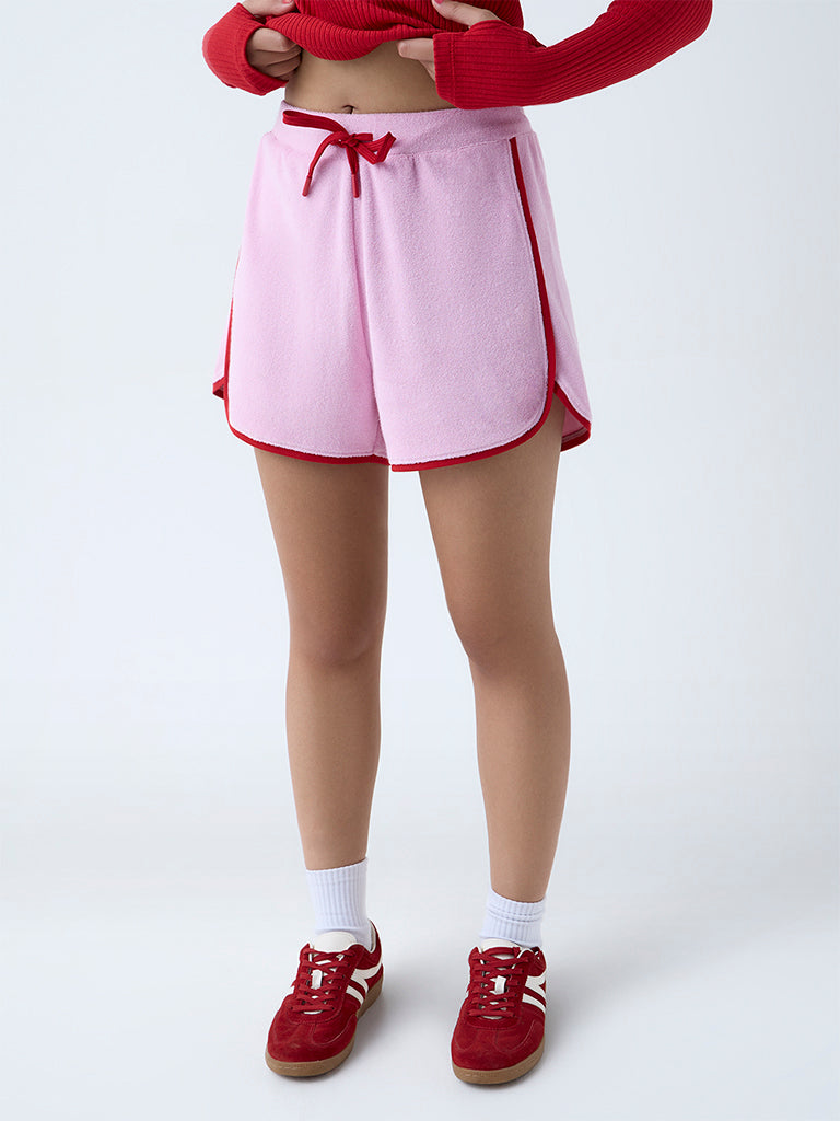 These pink shorts from Studiofit make a striking statement with contrast piping that adds bold definition. Cut from a textured cotton-blend fabric. they feature a high-rise waist with adjustable drawstrings for all-day ease.