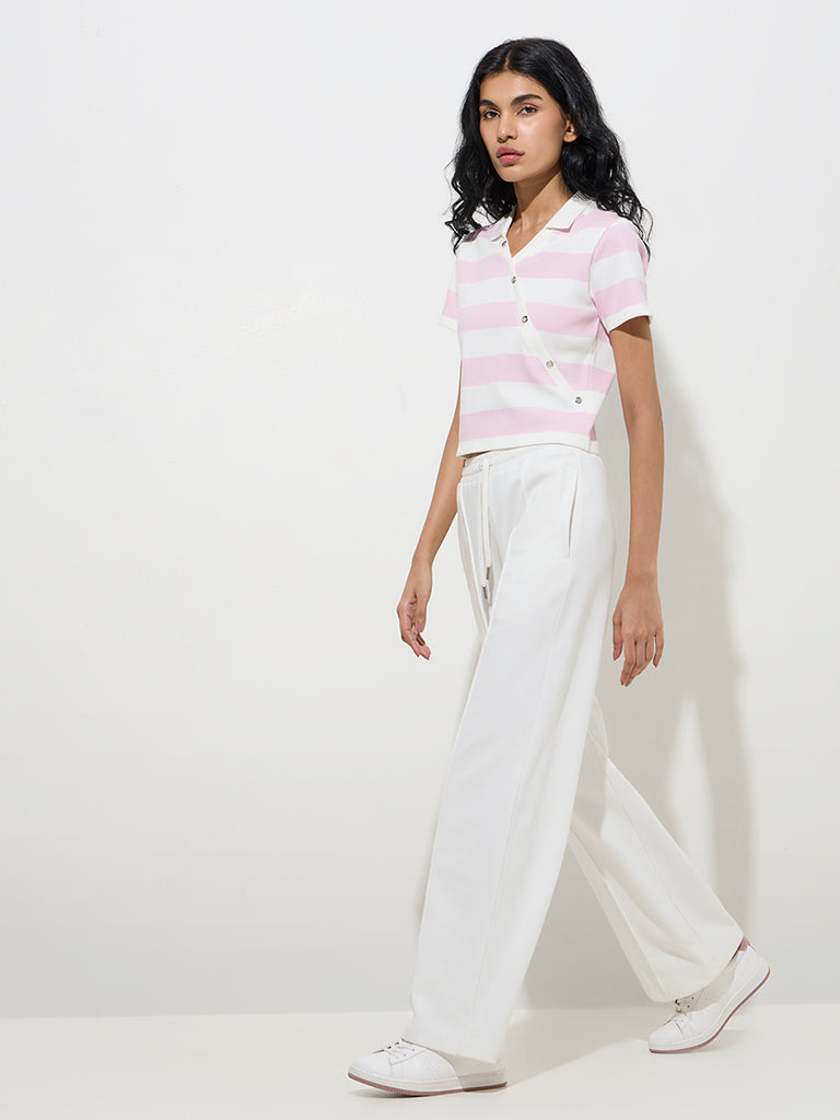 This pink t-shirt from Studiofit blends comfort with contemporary flair. Spun from a ribbed-textured fabric. it showcases striped prints that add visual interest. The V-neck collar flows into an asymmetrical button placket. while short sleeves round off the look with a touch of casual edge.