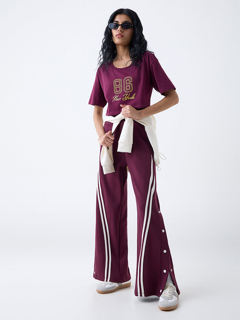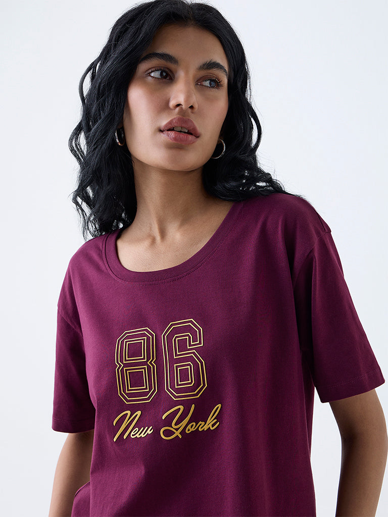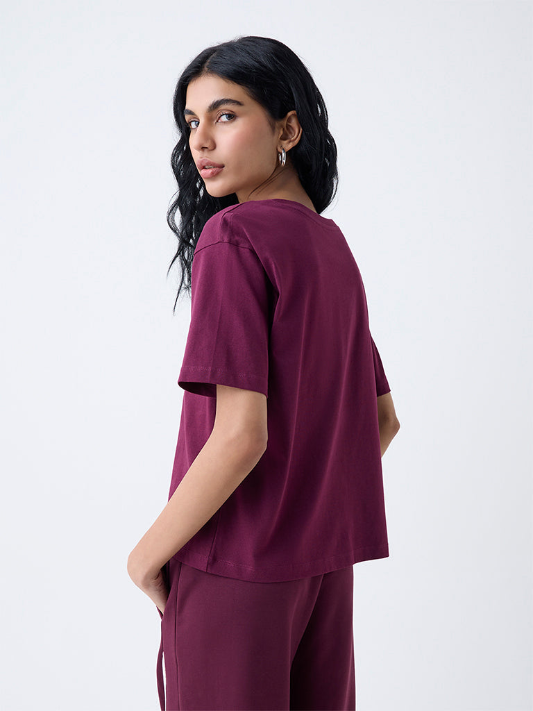 Made for active women on the go. this plum t-shirt from Studiofit combines comfort and style effortlessly. Woven from a cotton-rich fabric. it feels soft against the skin while ensuring breathability throughout the day. Framed with a round neck and short sleeves. it allows unrestricted movement. while numerical and text motifs add a sporty edge.