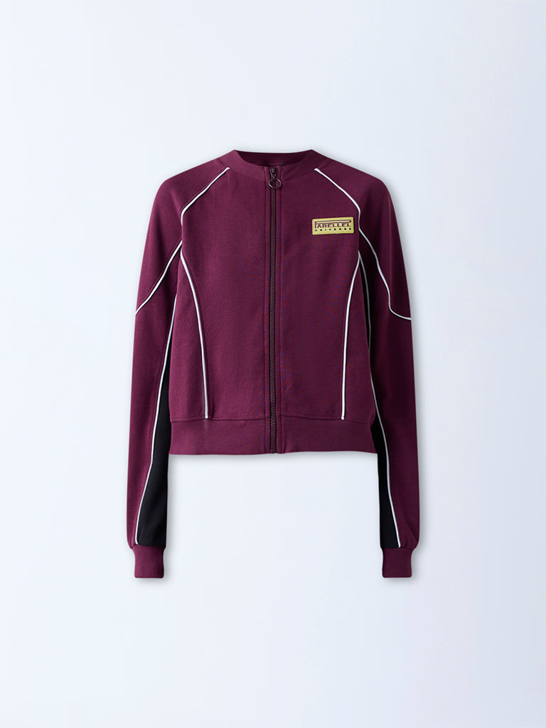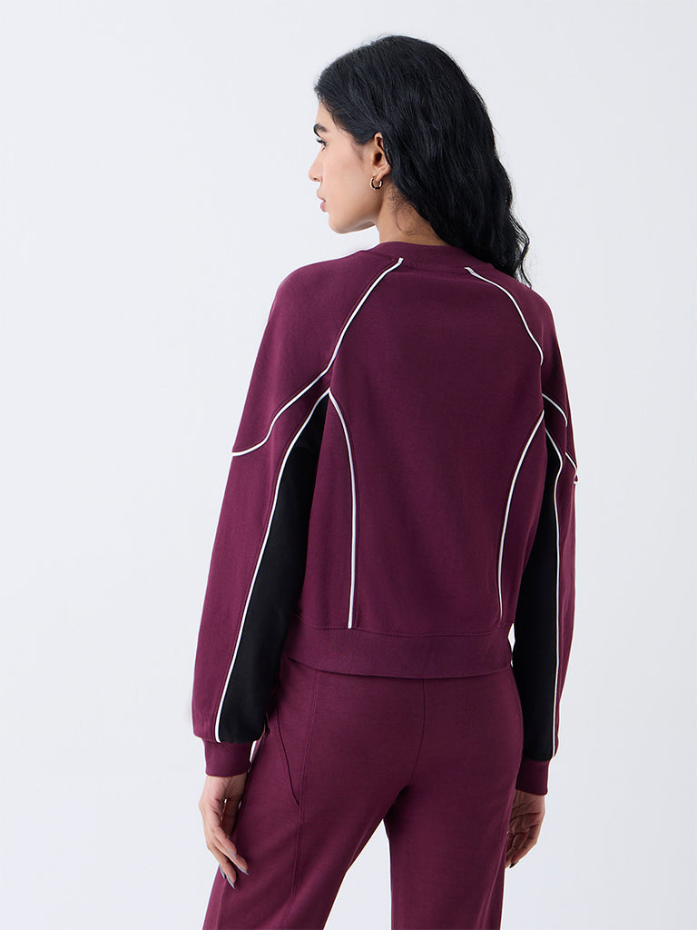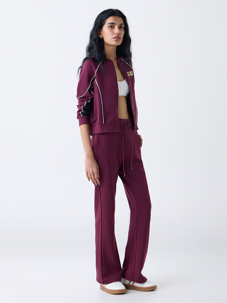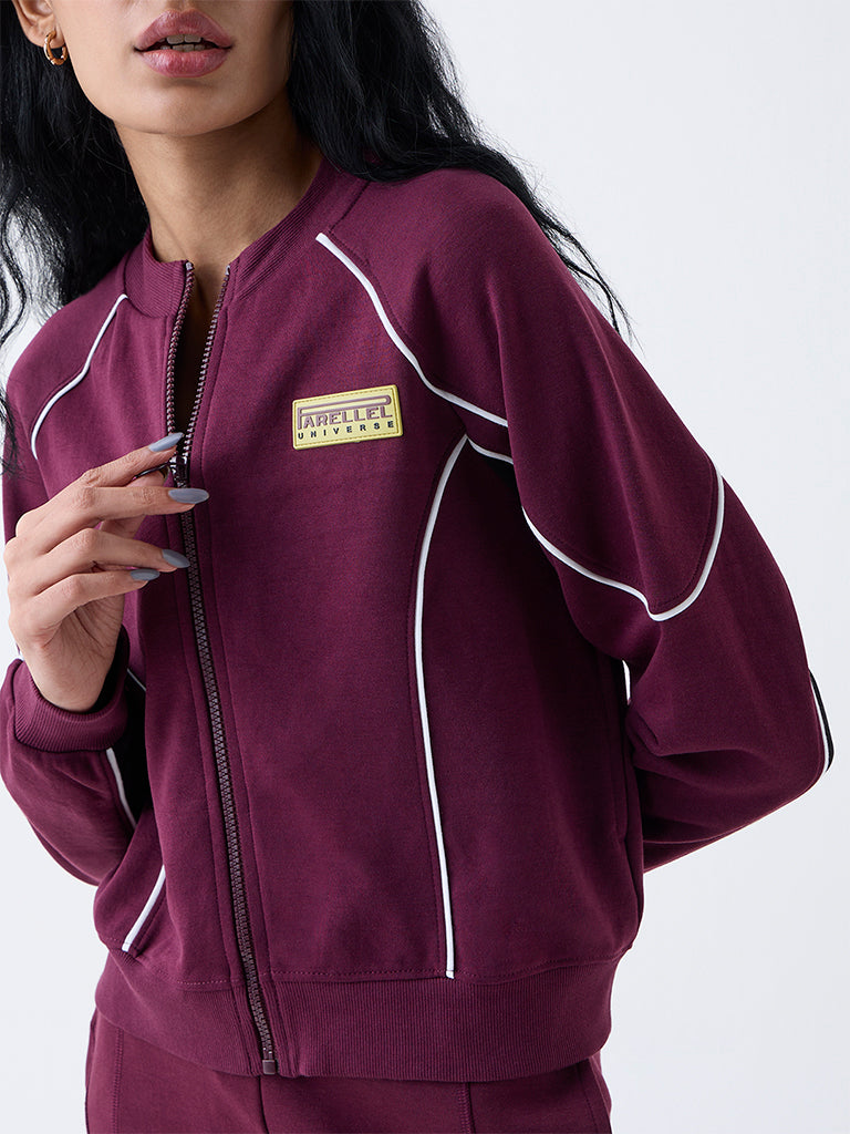 Boasting a sporty character. this plum jacket from Studiofit stands out with contrast pipeline detailing. Designed with a high neck. raglan sleeves and a front zipper. it’s crafted from premium-blend fabric for easy movement. Ribbed trims complete the look with a structured. modern finish.