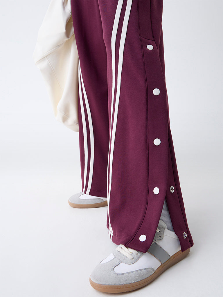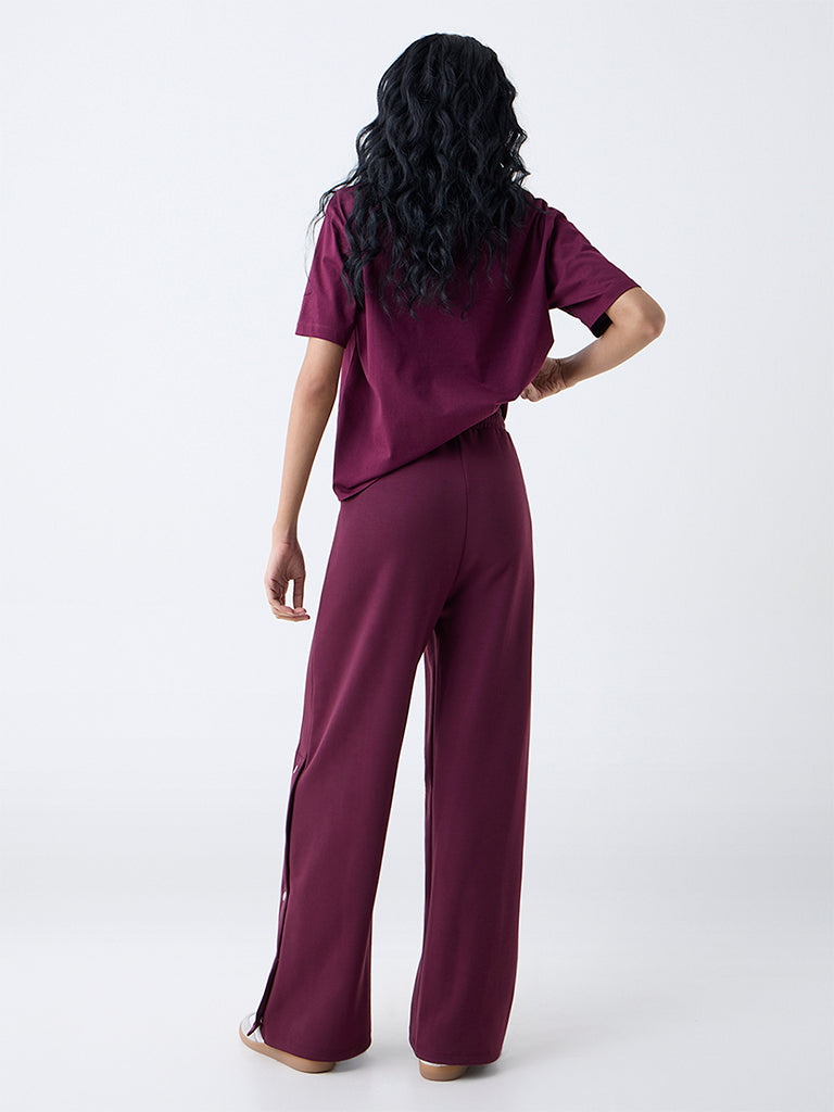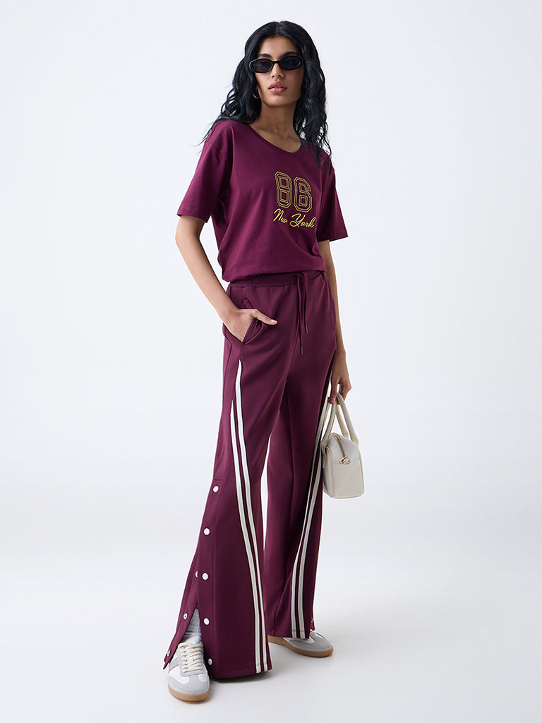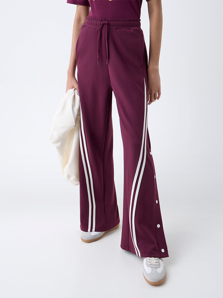 Enhance your activewear assortment with these plum pants by Studiofit. Spun from an ultra-soft fabric. they offer all-day comfort. while the elasticated drawstring waistband ensures a personalized fit. Functional side pockets add convenience. and striped detailing along the sides elevates the sporty silhouette. making them perfect for workouts or relaxed weekend wear.