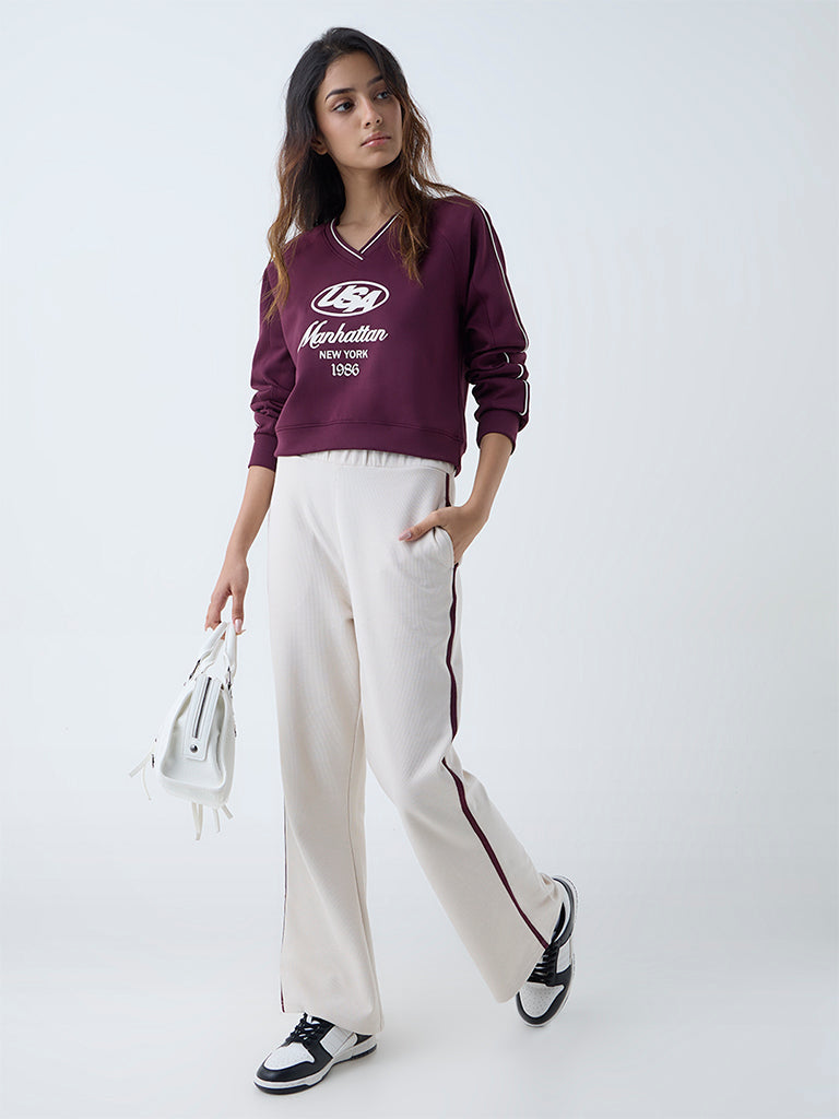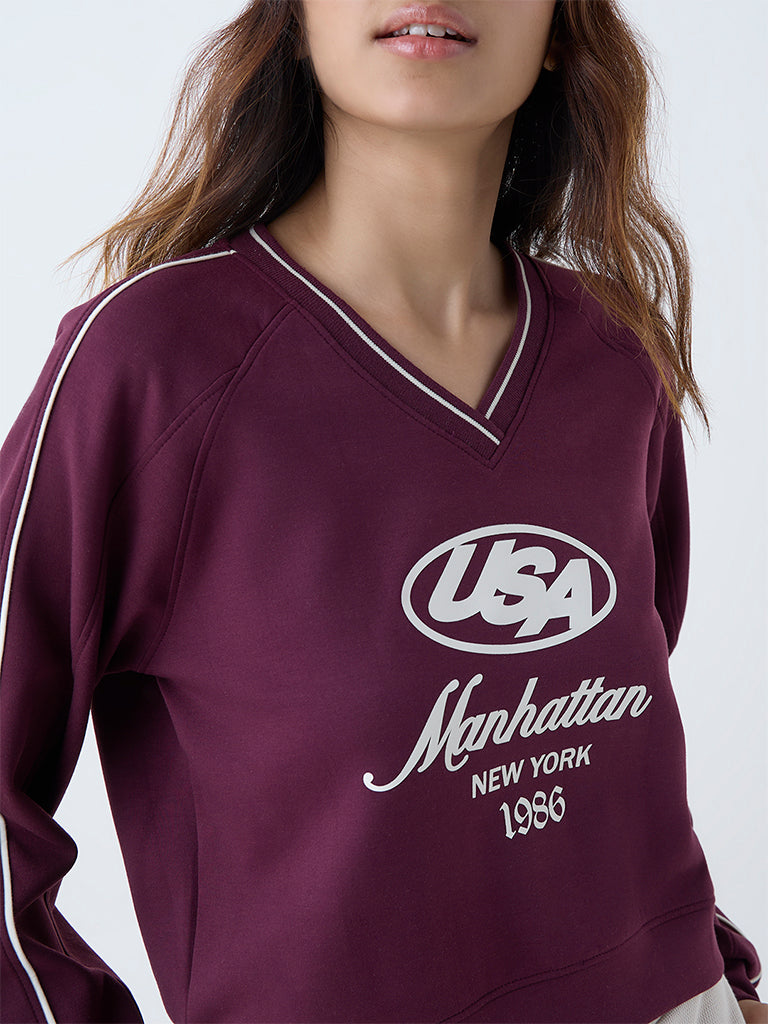 This plum t-shirt from Studiofit is crafted from a soft. breathable fabric for everyday ease. Featuring bold text detailing across the front. it’s framed with a V-neck and full sleeves. This garment serves as a laid-back essential for relaxed outings or light workouts.