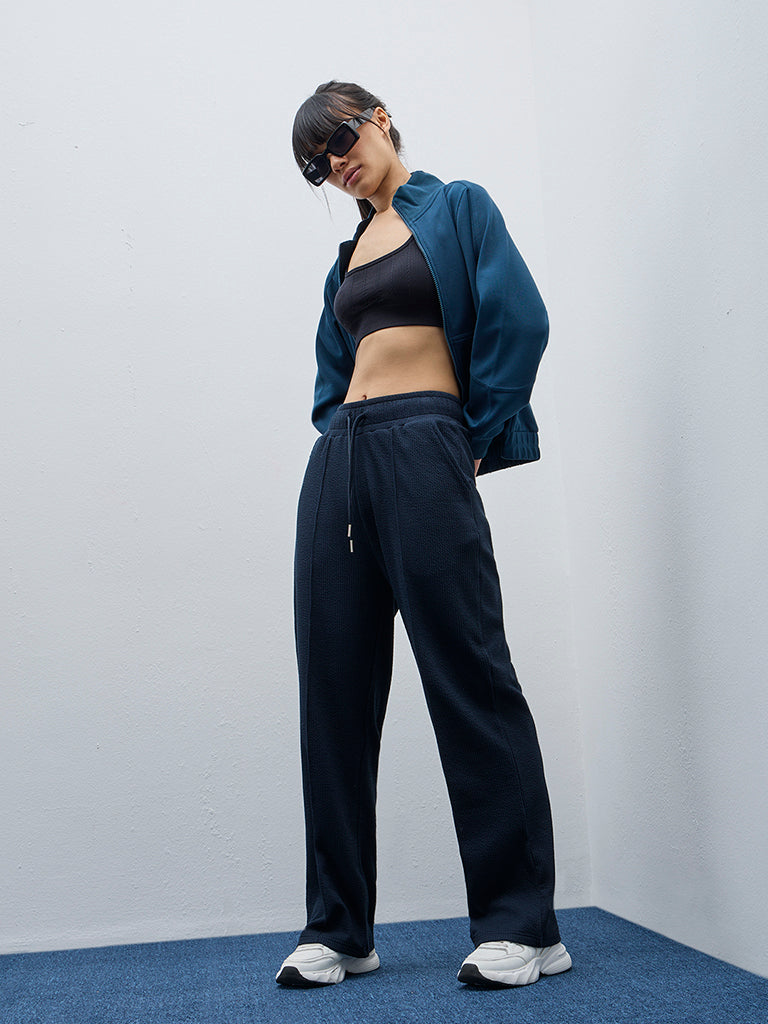 This super cool teal jacket by Studiofit showcases a solid design with a high-neck collar. Fashioned from an elasticated cotton-blend fabric. this athletic wear piece is complete with a zipper placket. full sleeves and side pockets.