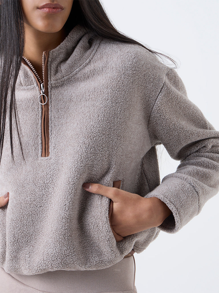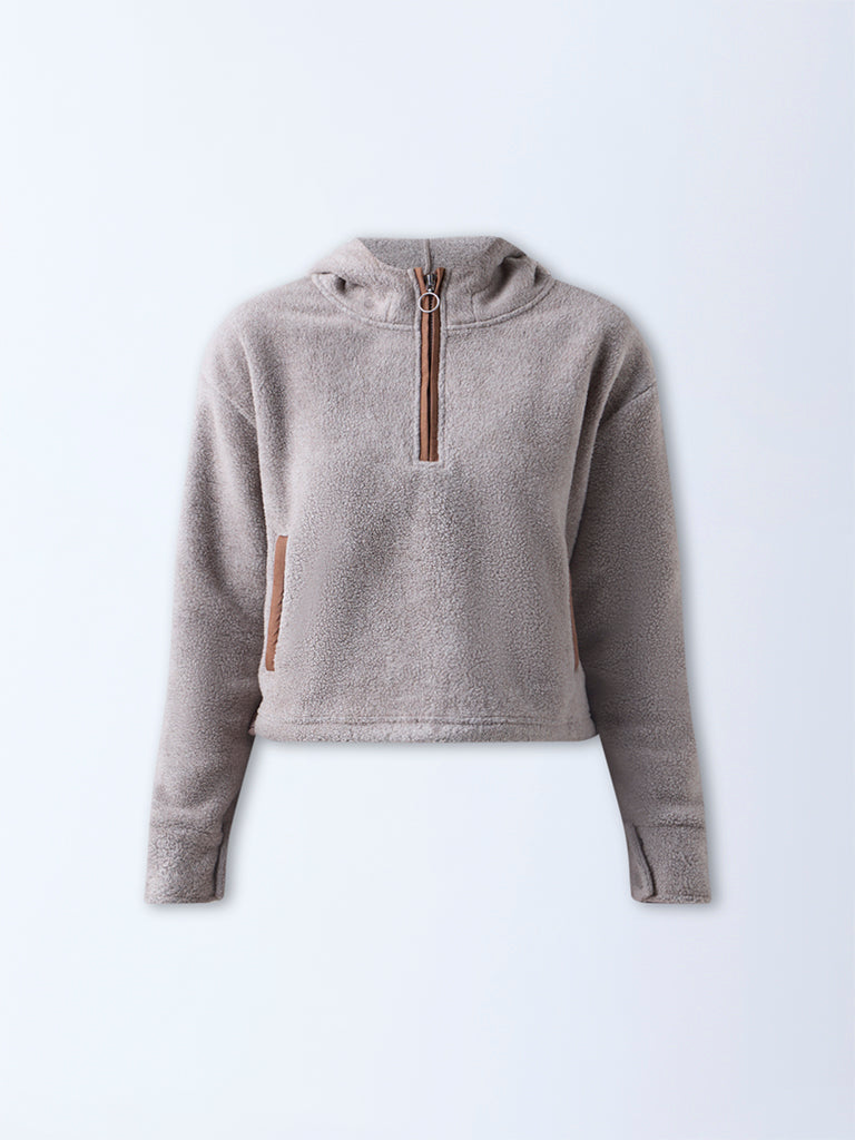 Effortlessly blending warmth and utility. this taupe fleece hoodie from Studiofit is designed for cool-weather layering. The quarter-zip neckline. contrast brown piping. and kangaroo pockets bring functional style. while the hooded silhouette adds a sporty edge.