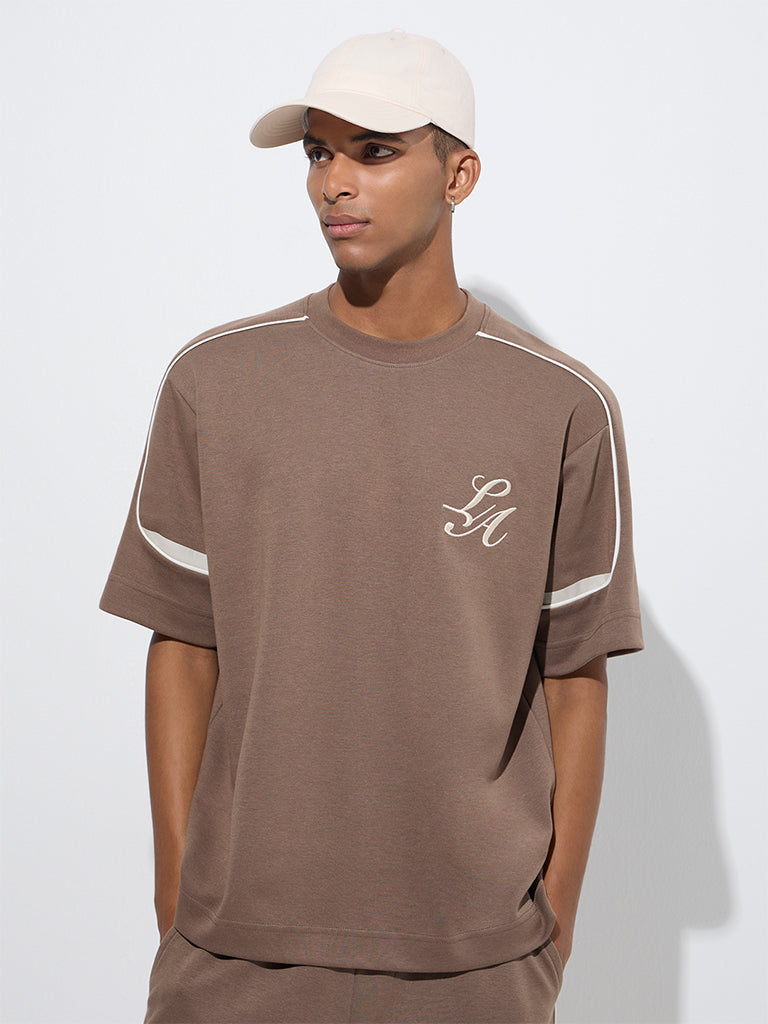 This taupe t-shirt from Studiofit blends laid-back comfort with athleisure edge. Cut from a soft cotton-blend fabric in a relaxed fit. it’s perfect for everything from weekend lounging to casual workouts. The minimal typographic embroidery adds a hint of style. while the classic round neck and half sleeves keep it effortlessly versatile.