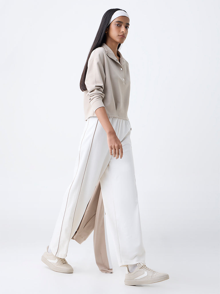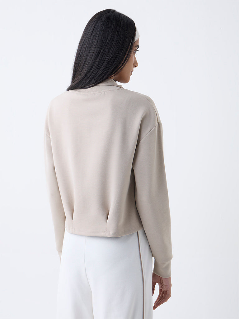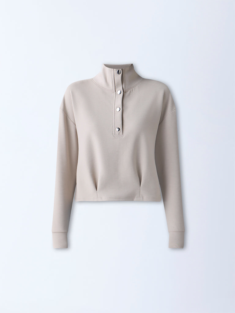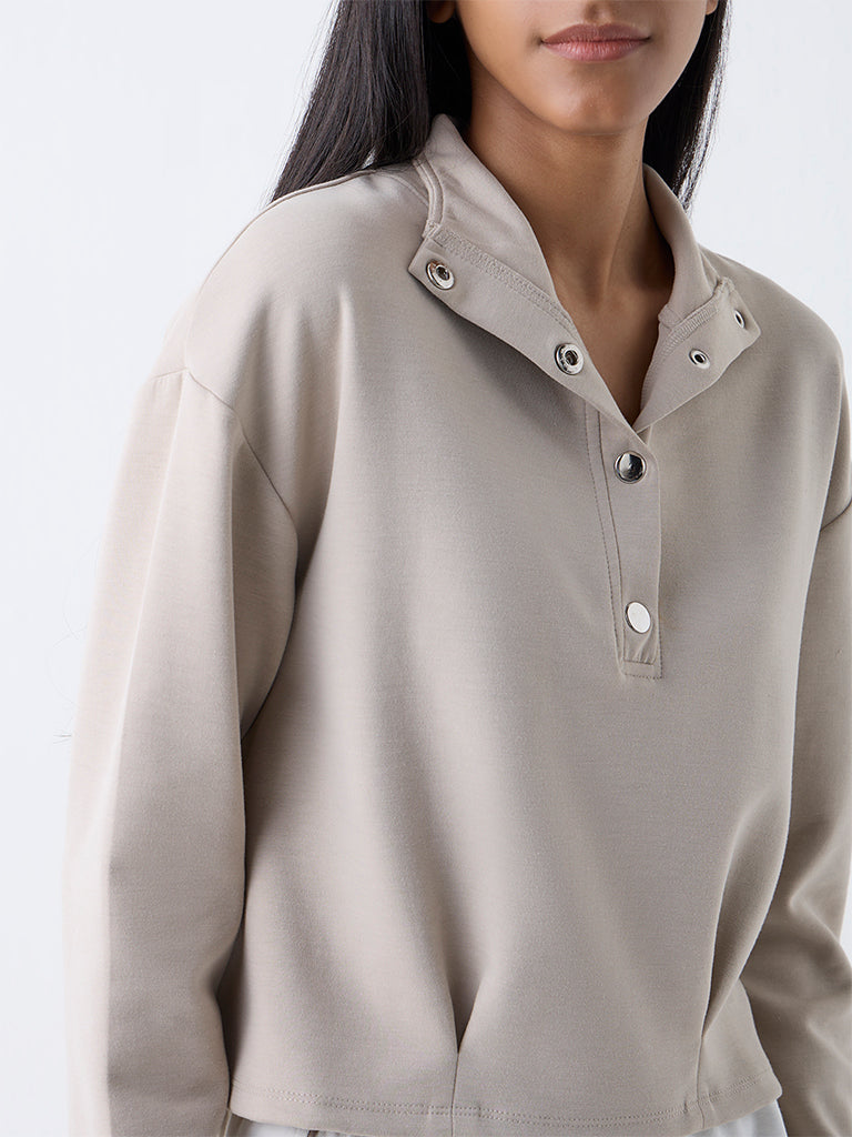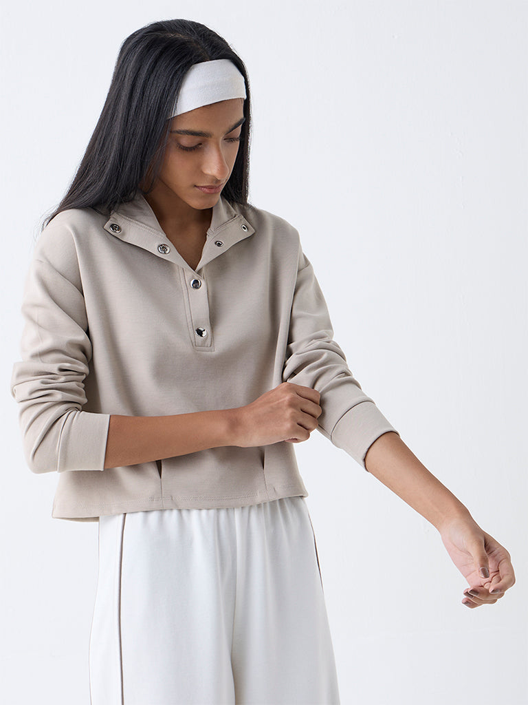 Refined yet effortless. this taupe solid cotton-blend t-shirt from Studiofit features a chic high neck with sleek button-down detailing. Designed with full sleeves and a breathable finish. it strikes the perfect balance between modern style and everyday comfort.