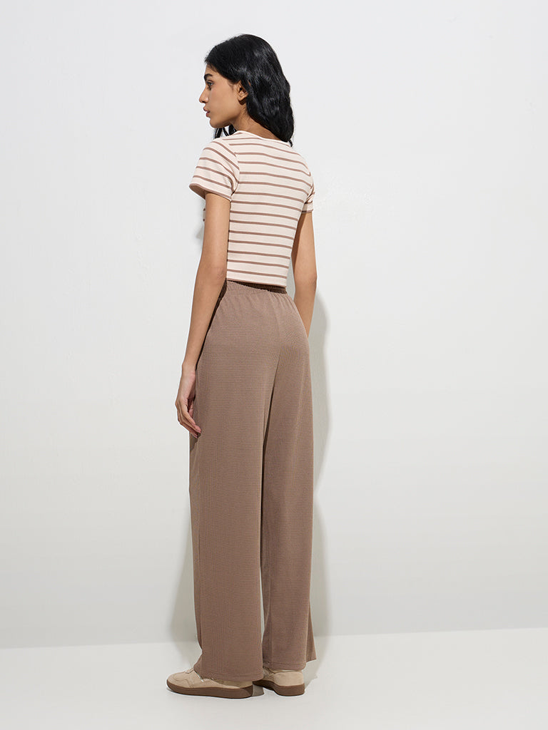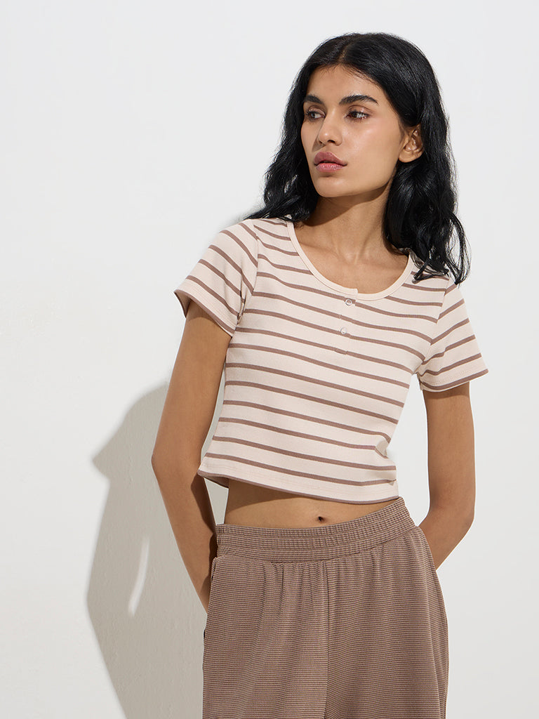 Studiofit Taupe Striped Cotton-Blend T-Shirt