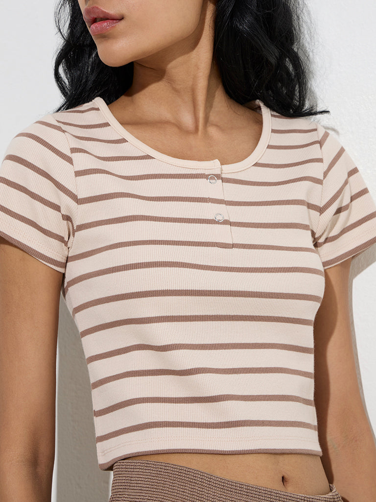 This taupe t-shirt from Studiofit is defined by striped prints. Made from a rich cotton-blend in a ribbed profile. it is complete with a round neck. short sleeves. and a two-button placket.