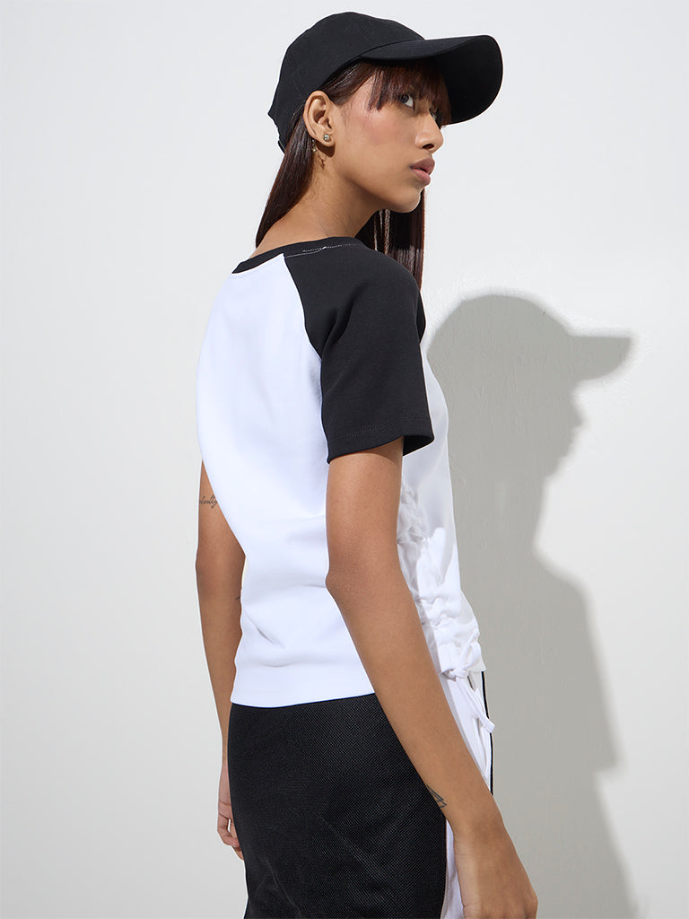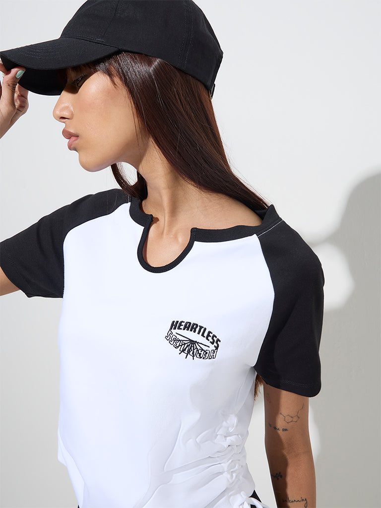 This white t-shirt from Studiofit boasts text motifs at the front for a stylish touch. Created from a blended-cotton fabric. it is fashioned in a colour-blocked profile with a split neck and raglan sleeves.