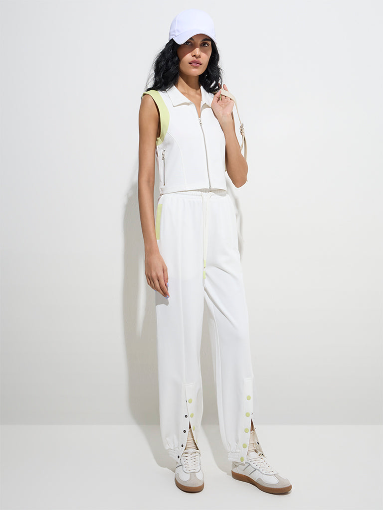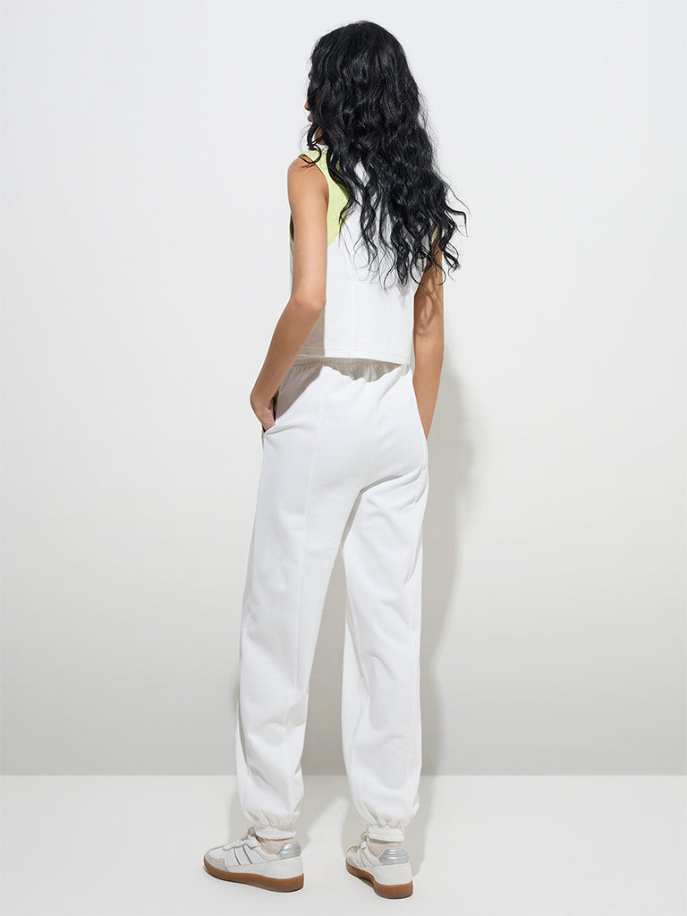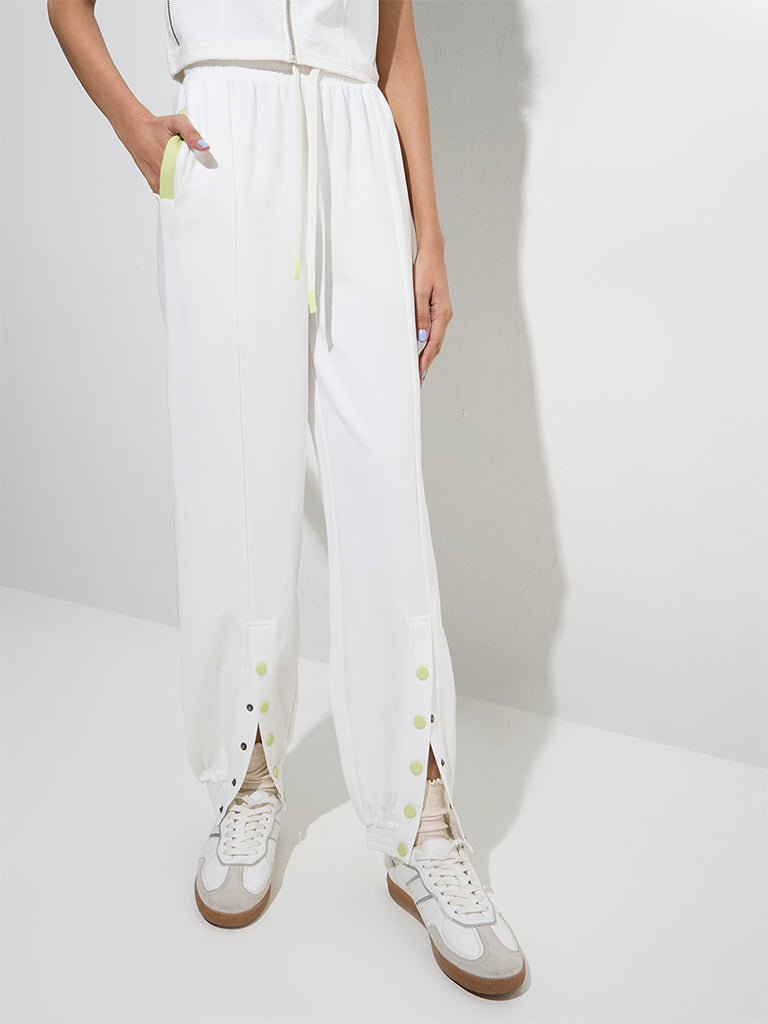 Studiofit presents these white joggers. tailored in a high-rise fit from high-quality fabric for a soft feel. Featuring an elasticated waistband with attached drawstrings for an adjustable fit. this pair is designed with functional side pockets and finished with snap-button accents for added edge.