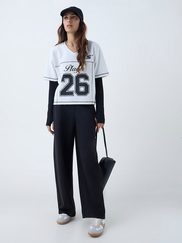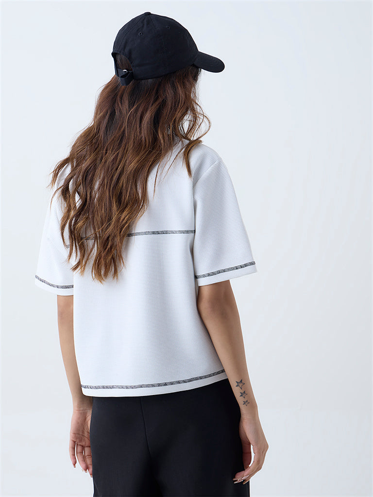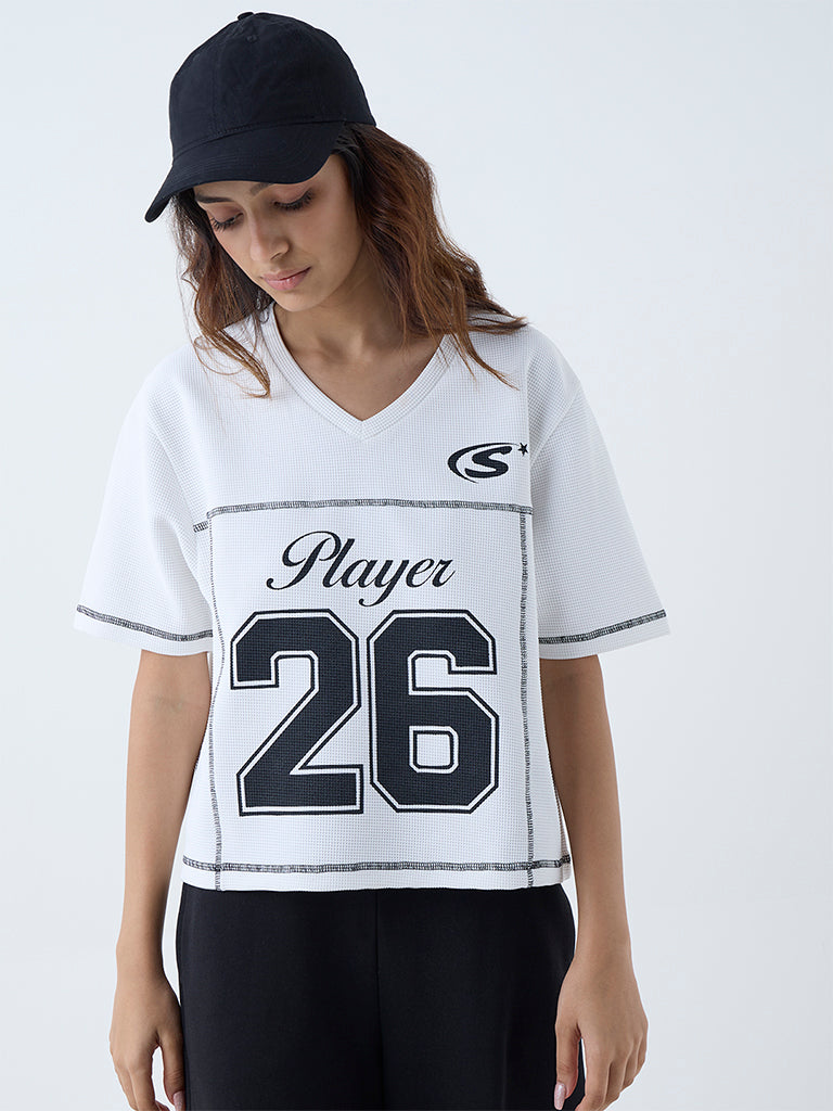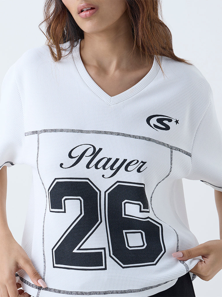 Designed for the active woman. this white tee from Studiofit pairs performance-ready functionality with contemporary style. Made from a waffle-textured fabric. it boasts striking numerical prints at the front for a sporty edge. The V-neck and short sleeves ensure ease of wear. making it a versatile choice for intense workouts or relaxed athleisure looks.