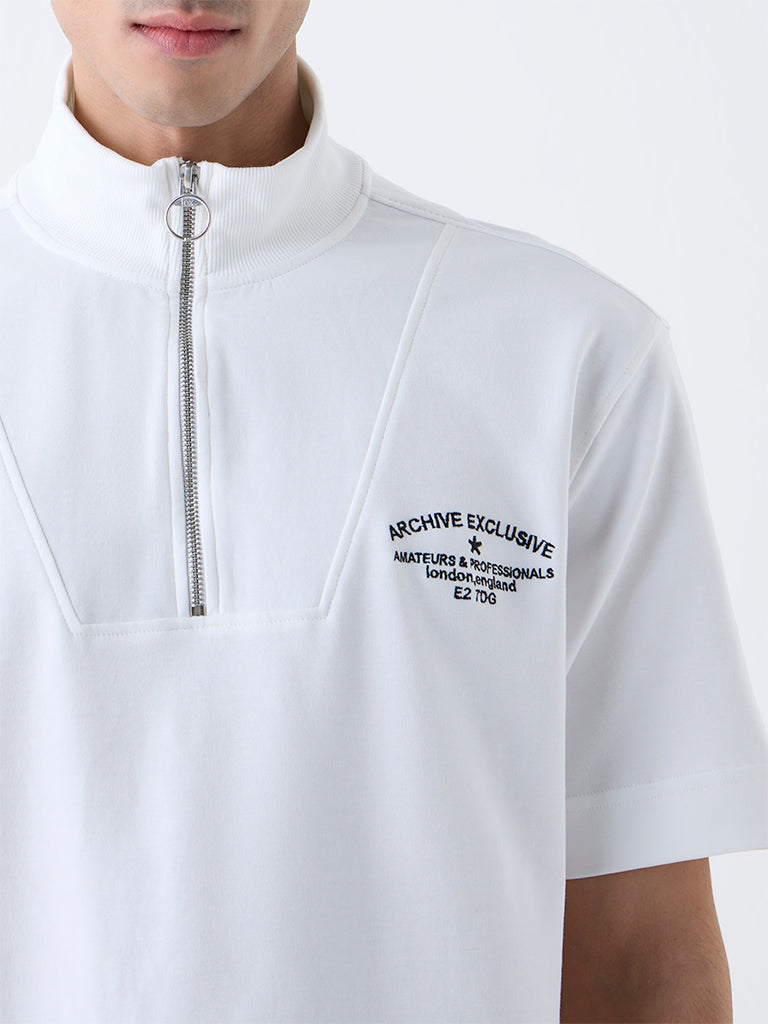 This white cotton-blend T-shirt from Studiofit brings a fresh update to athleisure dressing. Cut in a relaxed fit. it features a high neck with a sleek ziplined closure. short sleeves. and subtle text embroidery that adds a clean. contemporary edge.