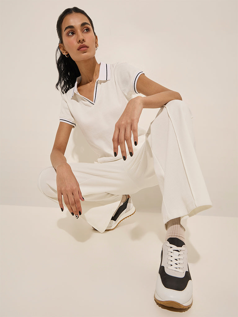 This white polo t-shirt by Studiofit flaunts a ribbed profile and carries a V-neck collar with short sleeves.