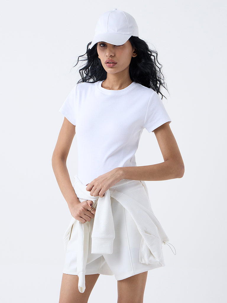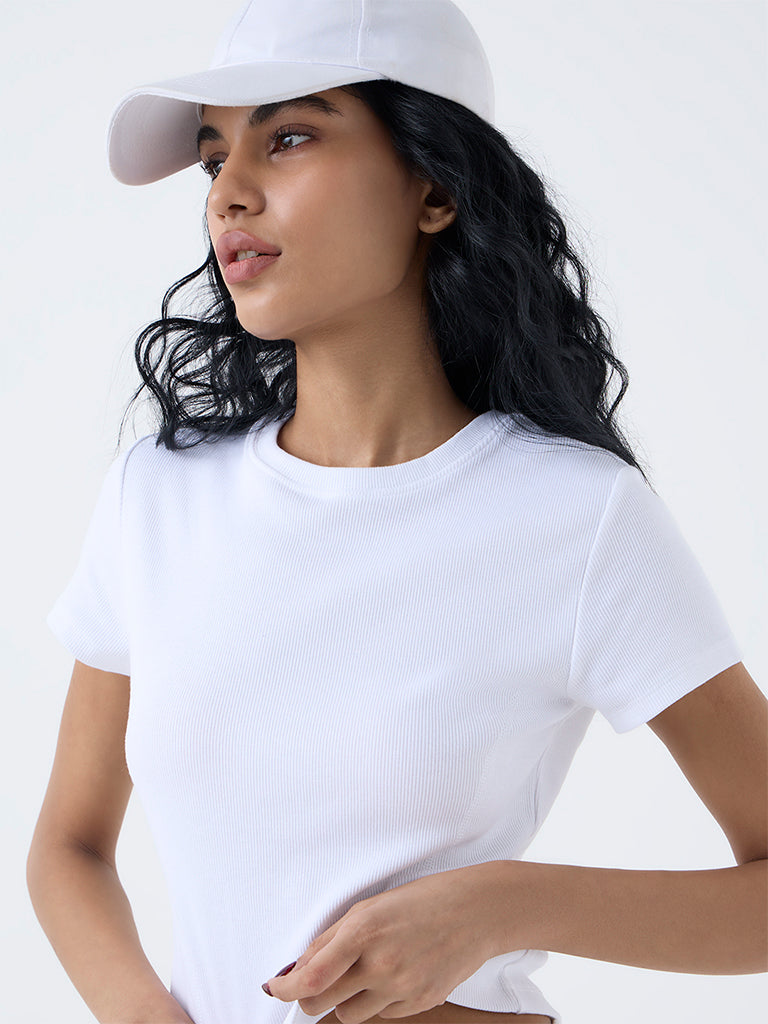Effortless and versatile. this white ribbed tee from Studiofit is crafted from a soft cotton-blend for everyday comfort. The round neck and short sleeves give it a timeless appeal. making it an easy staple for off-duty styling.