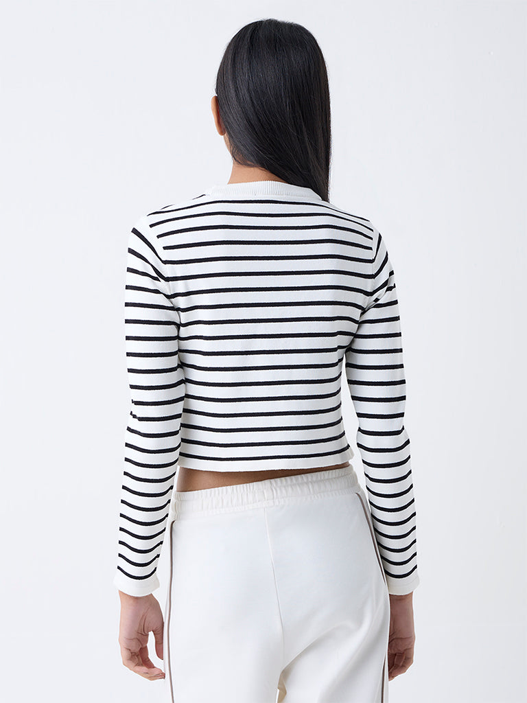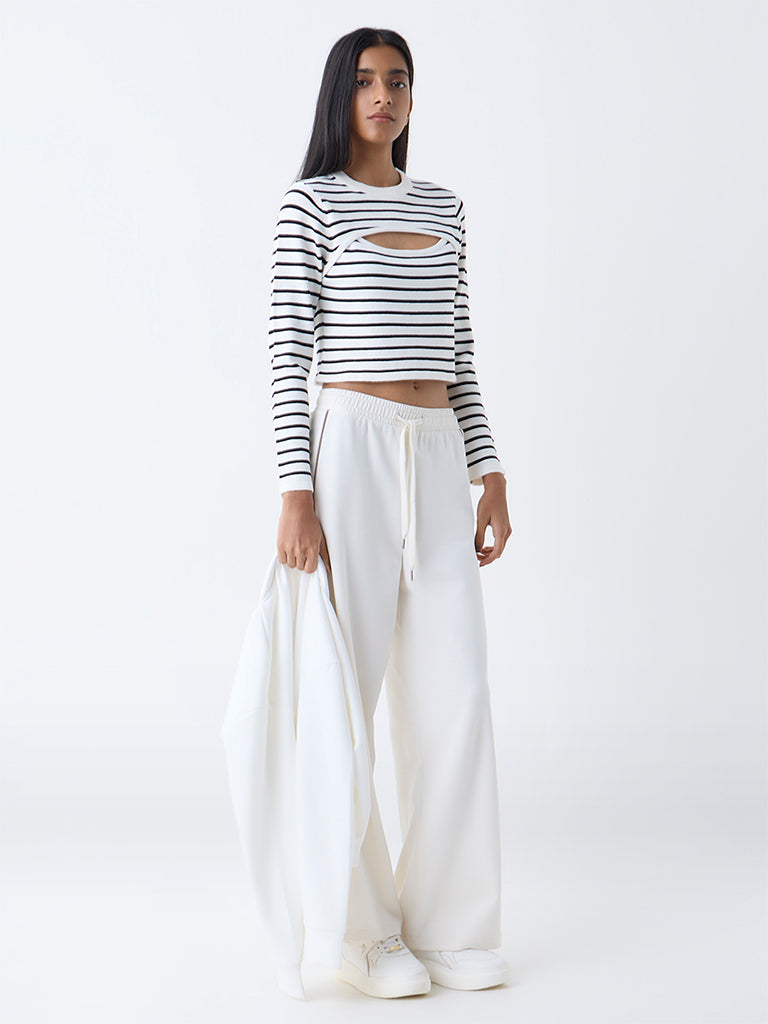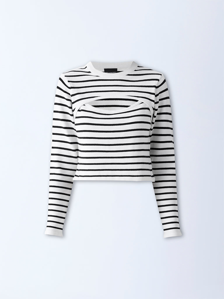 Effortlessly modern. this white striped top from Studiofit is crafted in a ribbed finish with a round neck and striking cut-out detailing. Designed with full sleeves. it brings a sleek balance of comfort and edge. making it a versatile piece for contemporary wardrobes.