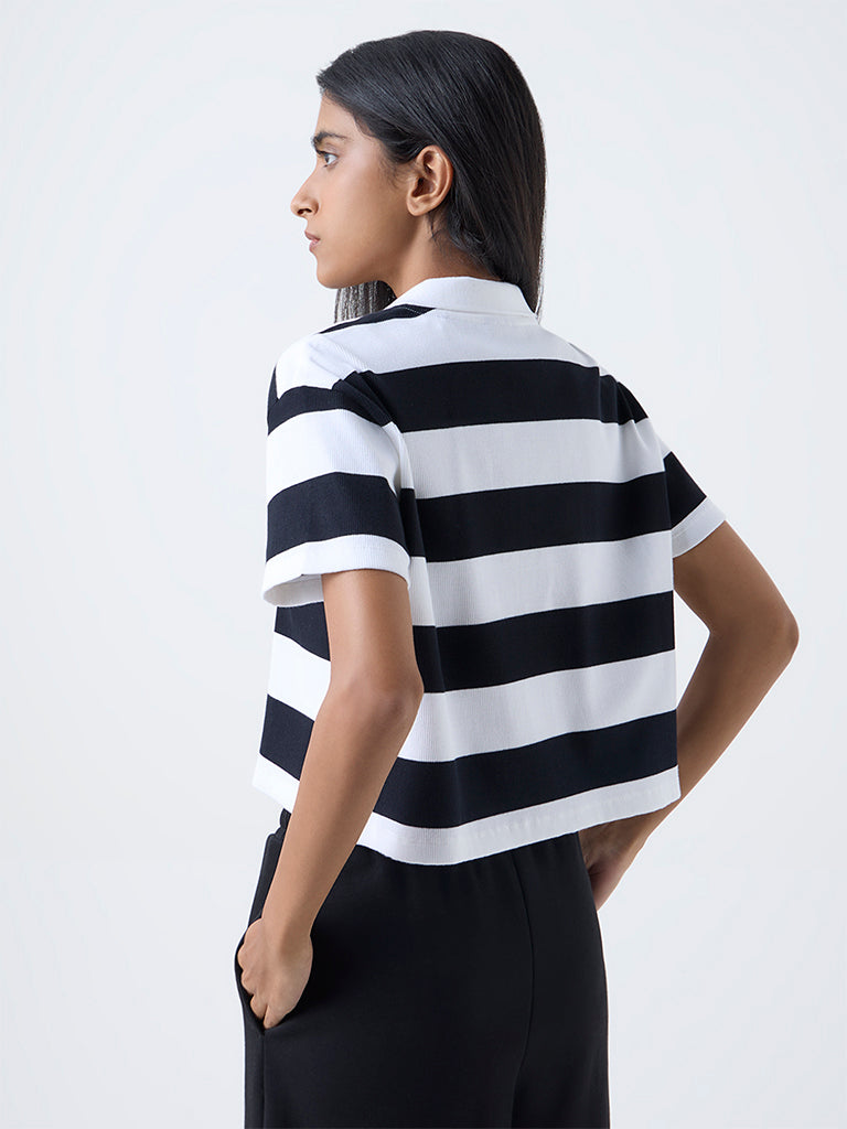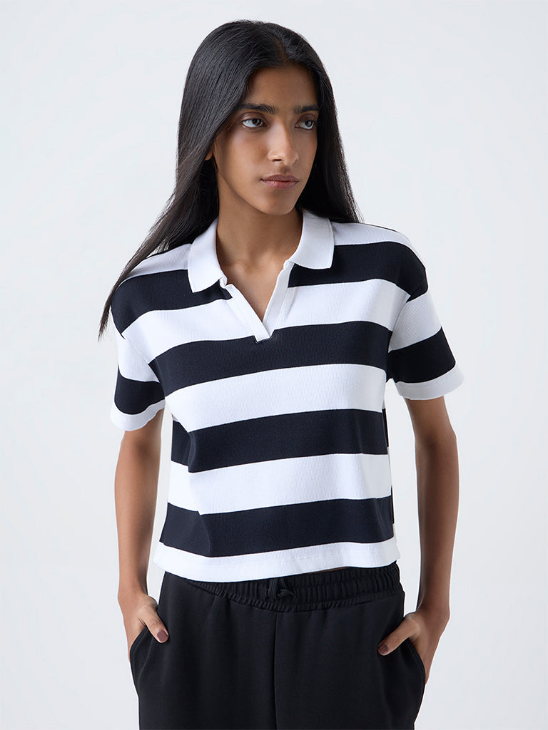 This white tee from Studiofit adds a sporty edge to casual dressing. Spun from a cotton-blend fabric. it’s designed with bold stripe prints for a striking look. Finished with a shirt collar and short sleeves. it’s an easy essential for laid-back days.