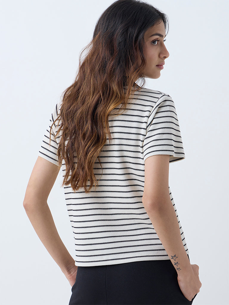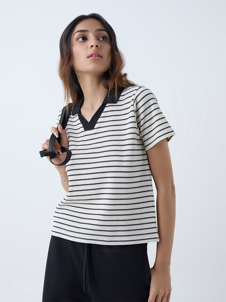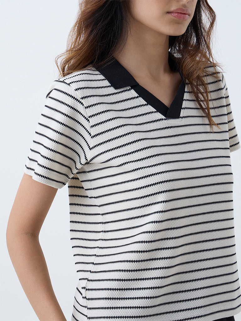 This white t-shirt from Studiofit features stripe prints on a pure cotton fabric with a textured finish. Framed with a contrast polo neck and short sleeves. it transitions easily between active routines and laid-back moments.