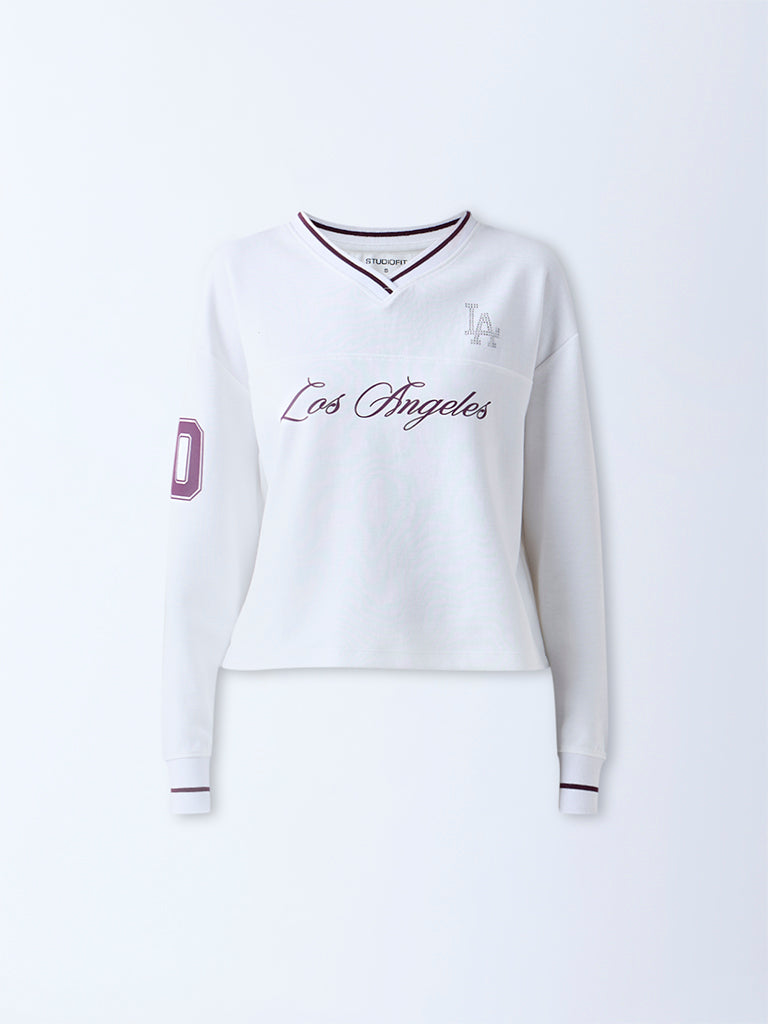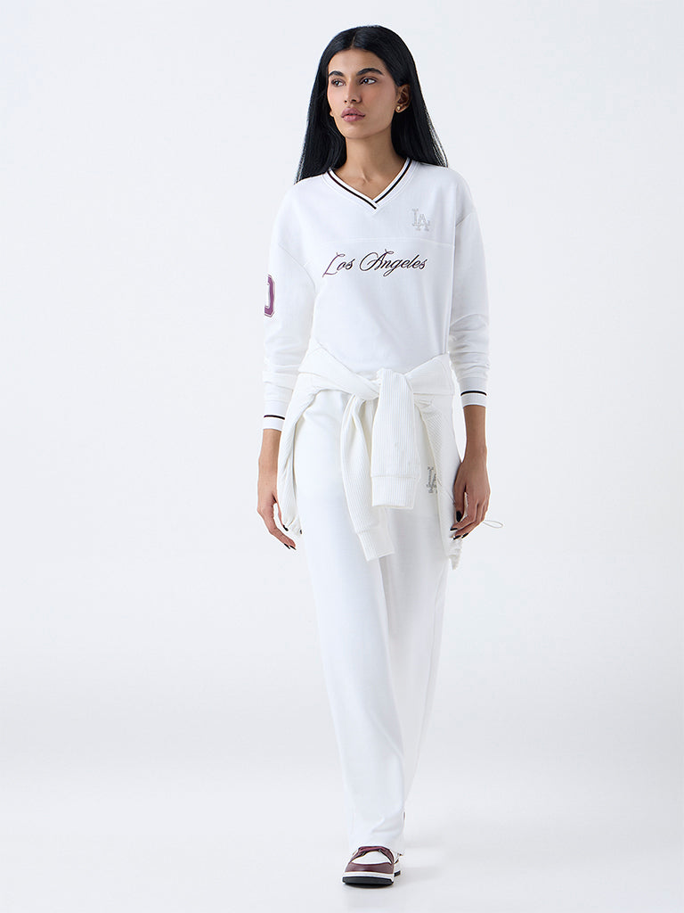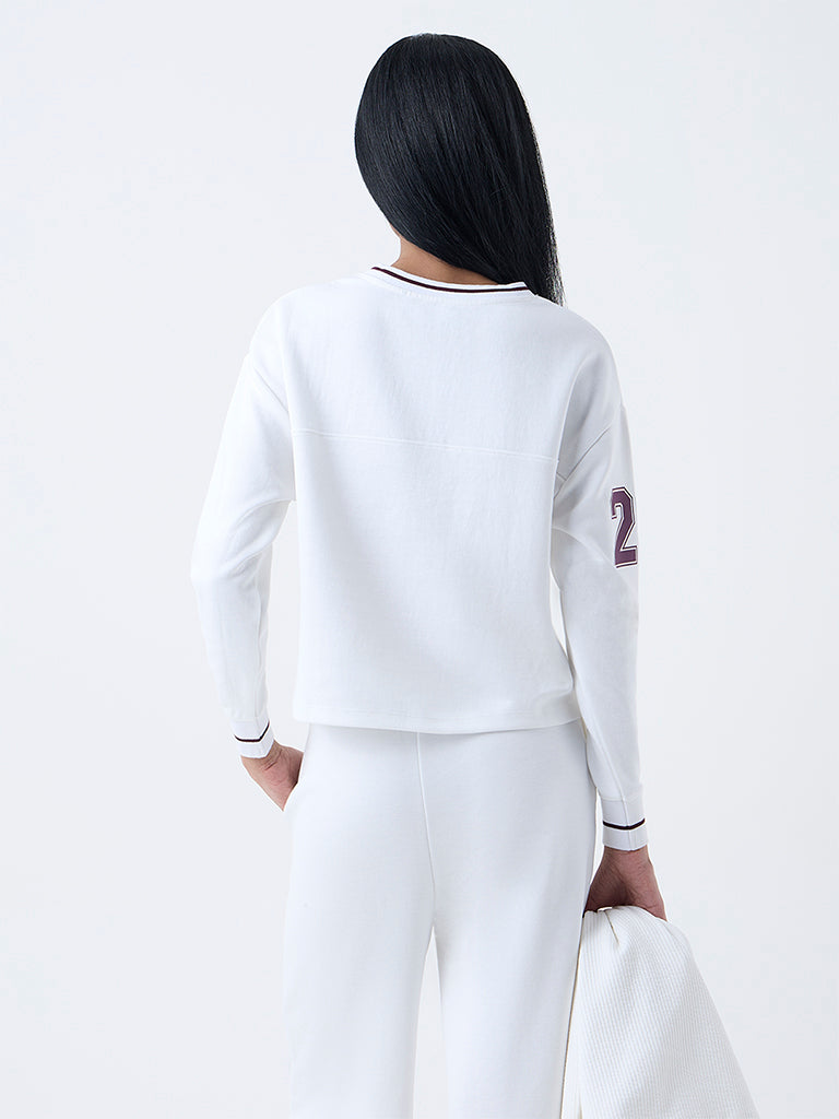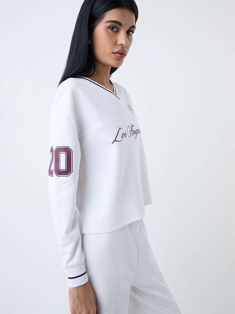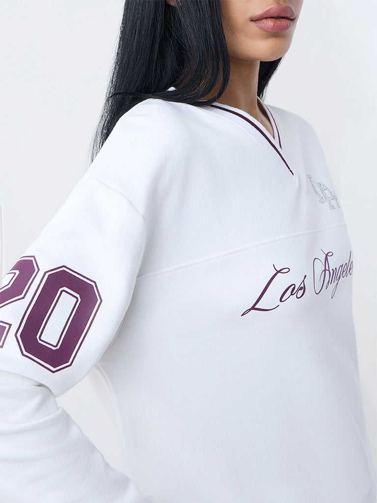 Studiofit brings a sporty edge to casual dressing with this white cotton-blend T-shirt. Designed with a ribbed V-neck and full sleeves. it features a embellished text print that adds a modern. confident vibe.