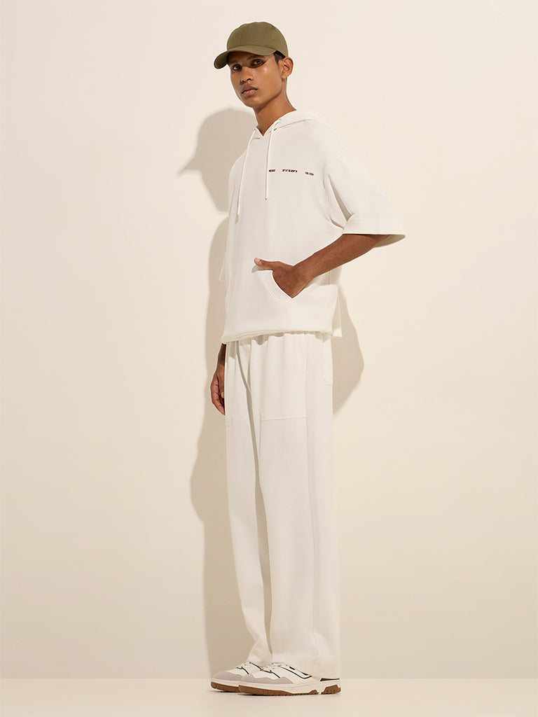 This white hoodie from Studiofit boasts subtle text prints. adding a touch of uniqueness to its relaxed silhouette. Milled from a breathable fabric. it features an adjustable hood. a cozy kangaroo pocket. and dropped sleeves for an effortlessly laid-back look.