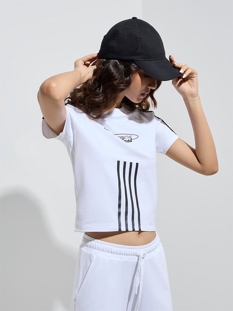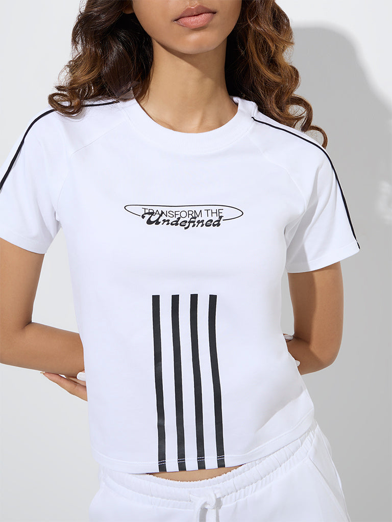 This white t-shirt from Studiofit brings effortless ease to your athleisure edits with its text patterns at the front. Cut from a soft cotton-blend fabric for all-day breathability. it’s finished with a classic round neck and short sleeves for a relaxed fit.