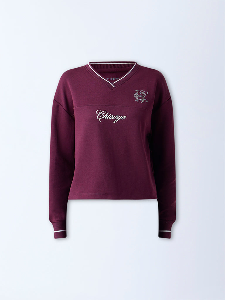 Make a statement with this wine cotton-blend T-shirt from Studiofit. Designed with a ribbed V-neck and full sleeves. it’s accented with an embellished text print that adds a touch of sparkle to your off-duty style.