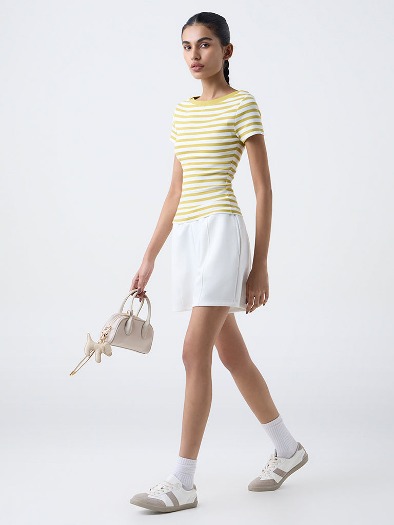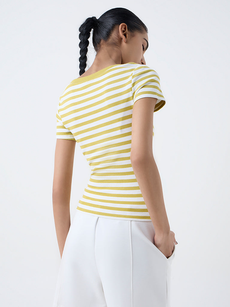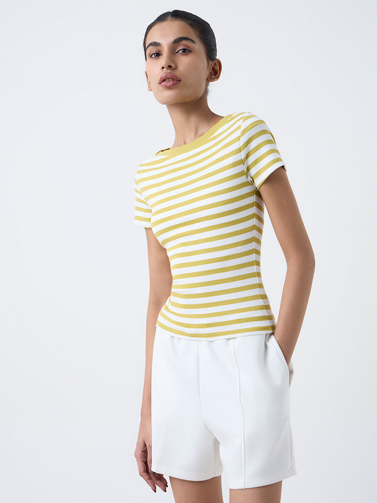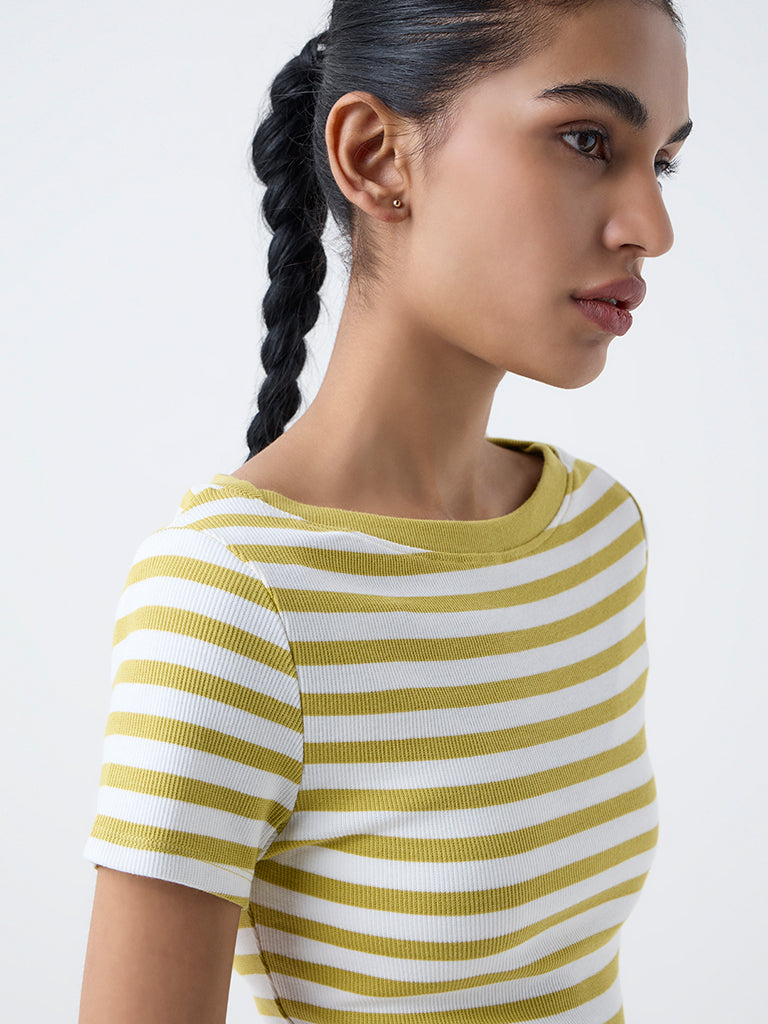 Studiofit Yellow Striped Cotton-Blend T-Shirt
