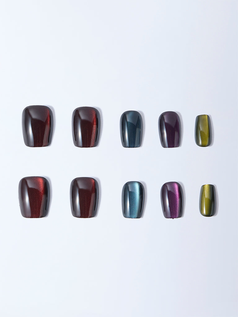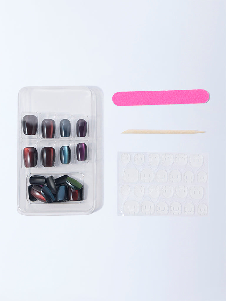 Bring a high-shine finish to your manicure with this Multicolour Cateye Press-On Nail Set from Studiowest. The kit includes 24 reusable press-on nails. 24 glue tabs. a cuticle stick. and a nail file. The collection features a mix of jewel-toned shades deep red. teal. violet. and green each enhanced with a reflective cateye effect. Pre-shaped and coated with a glossy finish. the nails create a salon-like look in minutes without polish. Lightweight yet durable. they apply and remove easily. making them a versatile choice for both daily wear and standout occasions.