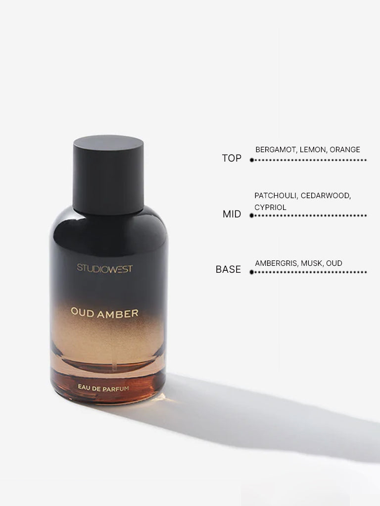 The journey of Oud Amber begins with an exhilarating burst of chocolate. saffron. and carnation making the initial spritz both refreshing and exotic by Studiowest. The heart of Oud Amber reveals itself in a luxurious blend of jasmine. rose. and amber and finally. the fragrance settles into a sumptuous blend of sandalwood. musk. and vanilla. Oud Amber leaves an unforgettable impression that lingers on the skin and is a statement piece that deserves a place on your vanity.