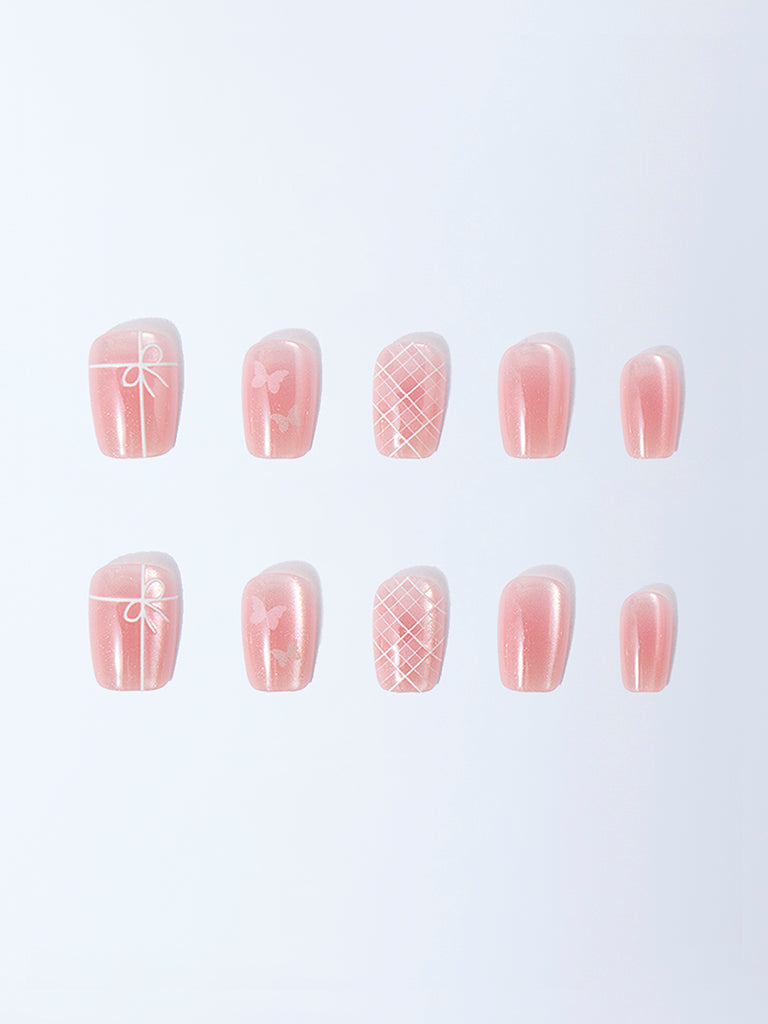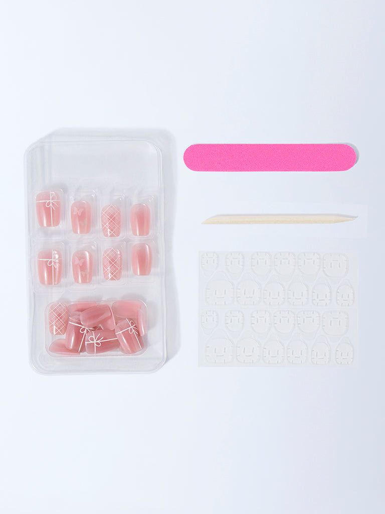 Studiowest introduces this peach press-on nail set. crafted to bring joy to your fingertips with minimal effort. It is include 24 reusable press-on nails. one cuticle stick. one nail file and 24 glue tabs. Set against a pearl-finish base. the mix of ribbon motifs. tonal butterflies and criss-cross plaid detailing captures the charm of unwrapping something special. Designed for quick application and comfortable wear. this set elevates your look in minutes and adds a polished finish to any occasion.