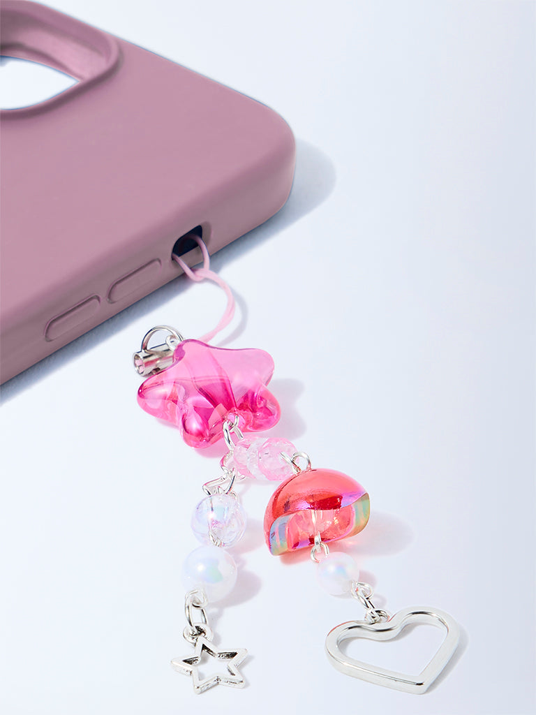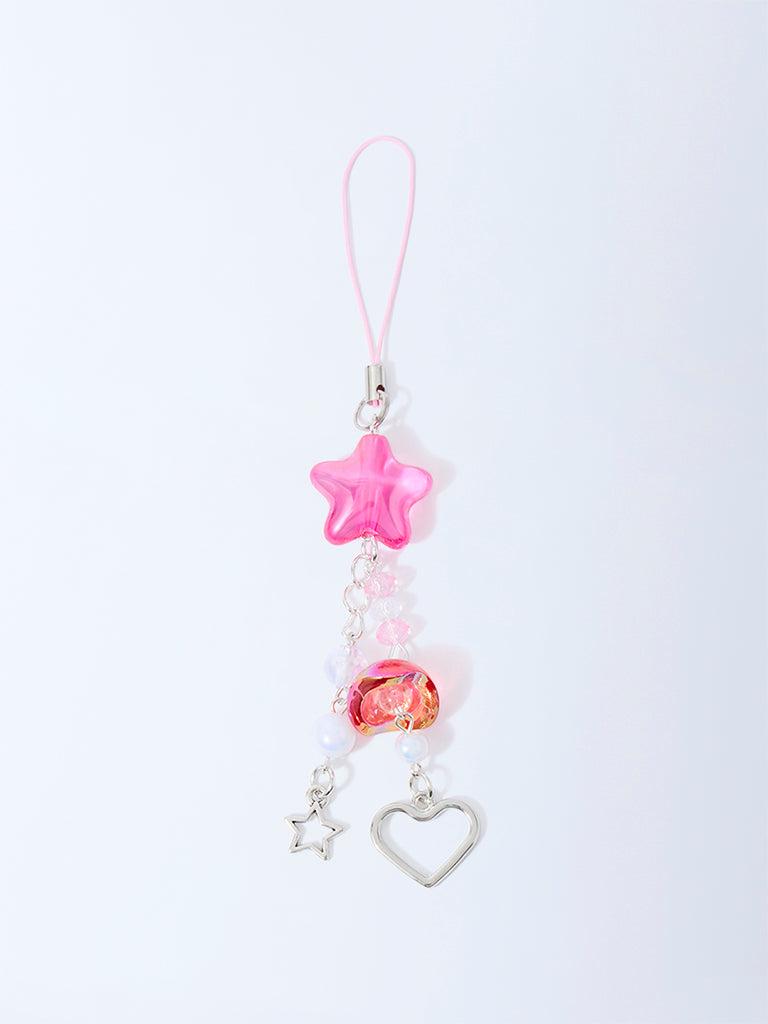 Add a playful accent to your everyday style with this pink charm from Studiowest. Designed with a pastel strap. this charm features a translucent star. a series of soft-toned beads. and a marbled pink orb. Two metallic outlines??a star and a heart??dangle at the end. adding movement and charm. Perfect for styling on bags. pouches or phone loops. this piece brings a light hearted. expressive detail to everyday looks.