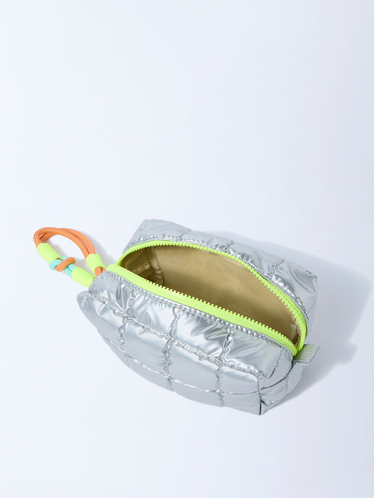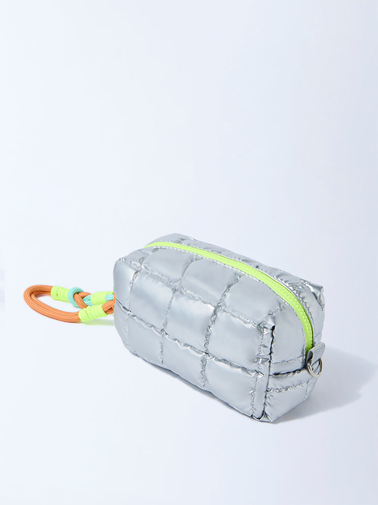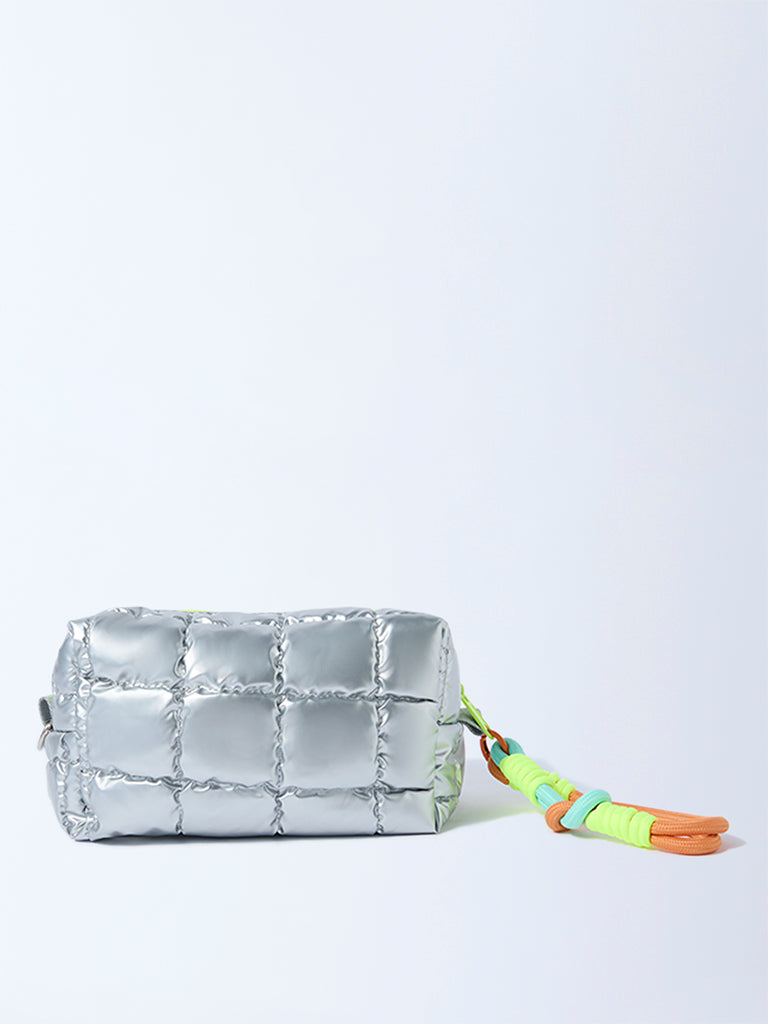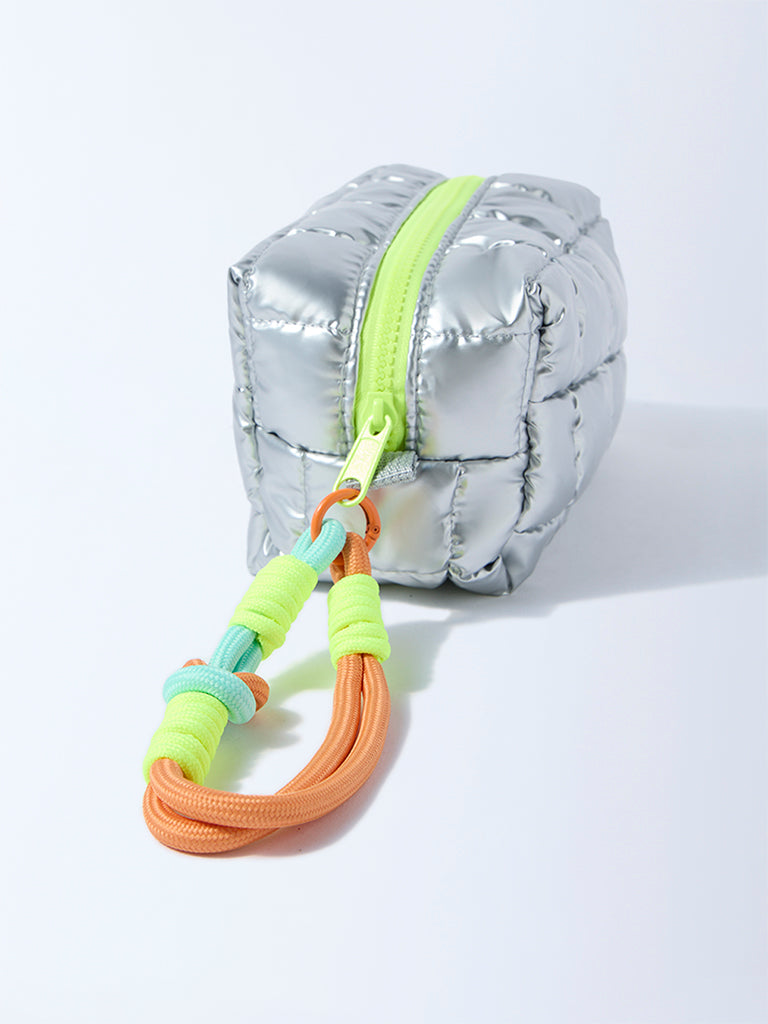 Compact. cushiony. and effortlessly cool ?? this Studiowest silver cube pouch channels futuristic flair with its glossy quilted texture. Designed with a neon pull tab and playful bag charm. it fuses function and fun in one sleek mini shape. The secure zip-top design and soft lining protect small valuables while keeping your look statement-ready. Perfect for storing lip balms. keys. or earbuds on the go.