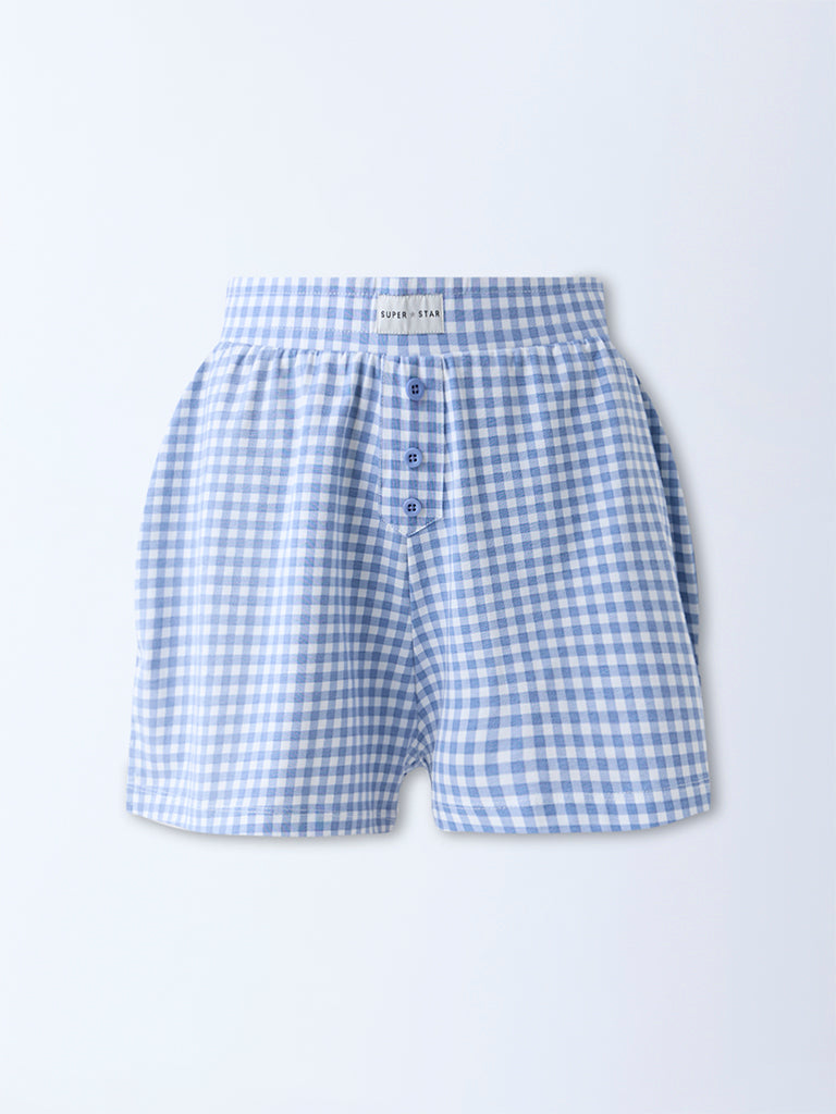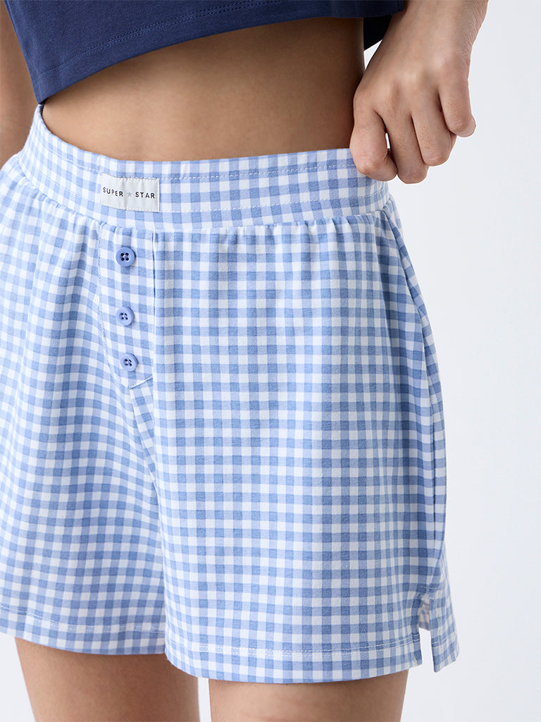 Superstar Blue Checkered Cotton-Blend High-Rise Shorts