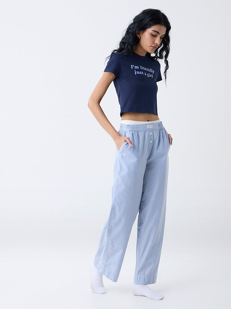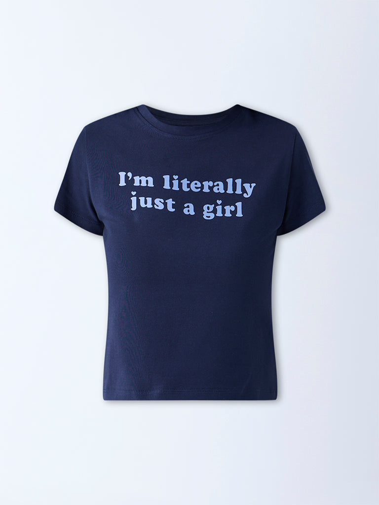 This dark blue t-shirt from Superstar highlights a bold texts print for a statement element. Crafted from a soft cotton-blend fabric. it sits in a cropped silhouette with a crew neck and short sleeves. offering a clean yet playful edge to casual dressing.