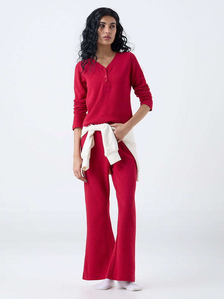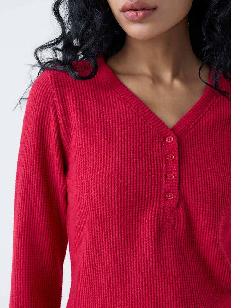 This red top from Superstar brings warmth and texture to your downtime wardrobe. Designed with a V-neckline. quarter button placket. and full sleeves. it offers a relaxed fit that transitions seamlessly from bed to brunch. The breathable waffle knit keeps you cool while adding a touch of cozy charm to everyday lounging.