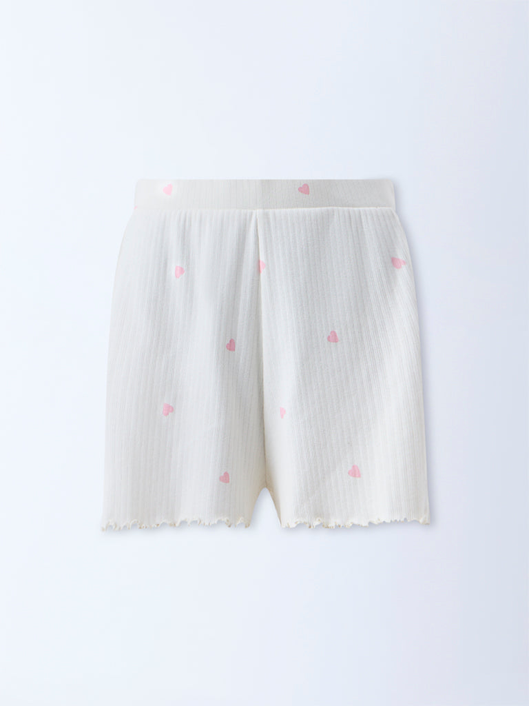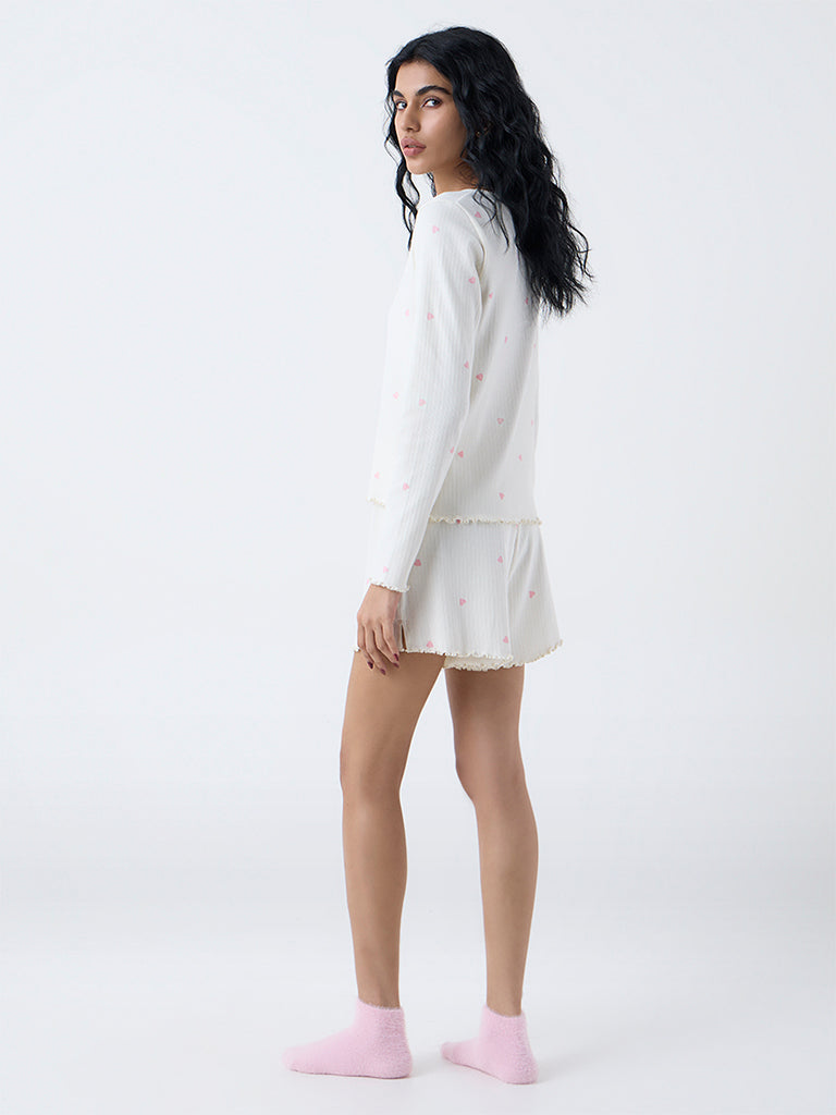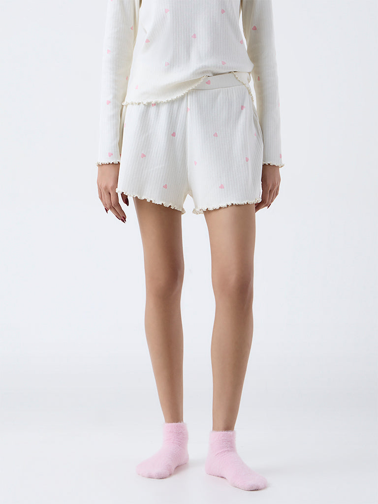 Superstar infuses playful charm into everyday comfort with these White high-rise shorts. Crafted from a soft cotton-blend. they feature a sweet heart print and a smooth elastic waistband for ease of wear. The fluted hemline adds a touch of movement and femininity. making them perfect for lounging or casual day outs.