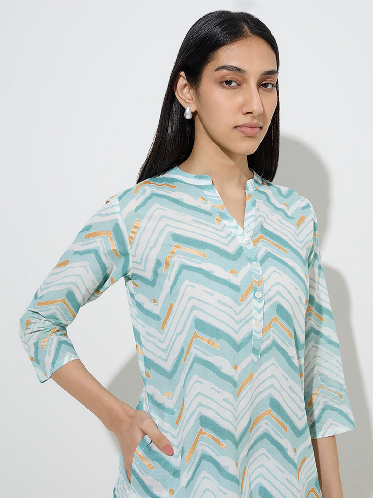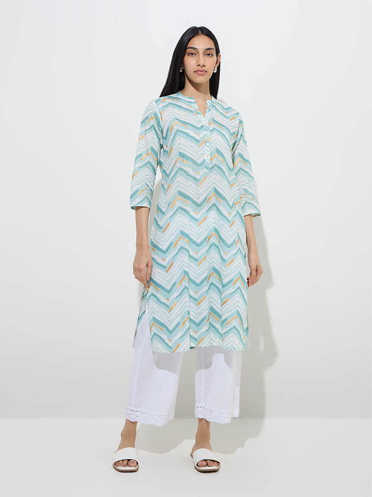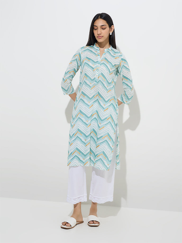 Utsa Aqua Chevron Patterned Straight Cotton Kurta