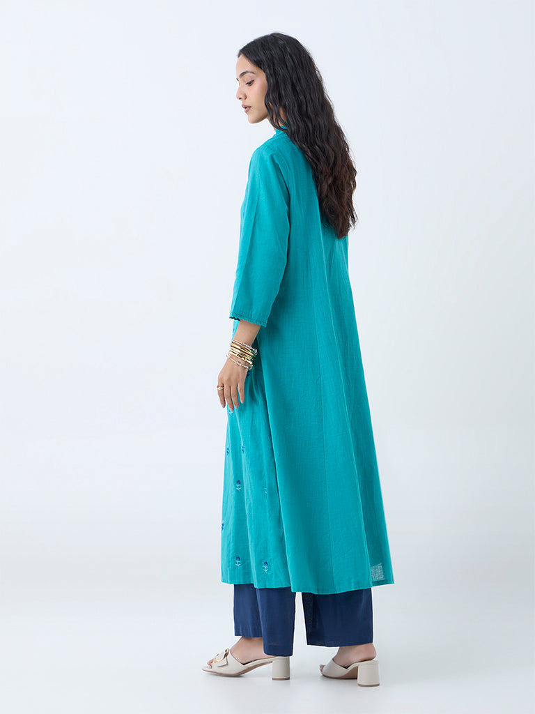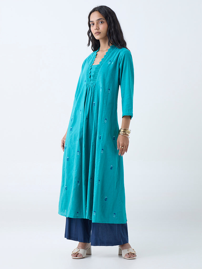 Utsa Aqua Floral Embroidered Cotton A-Line Kurta