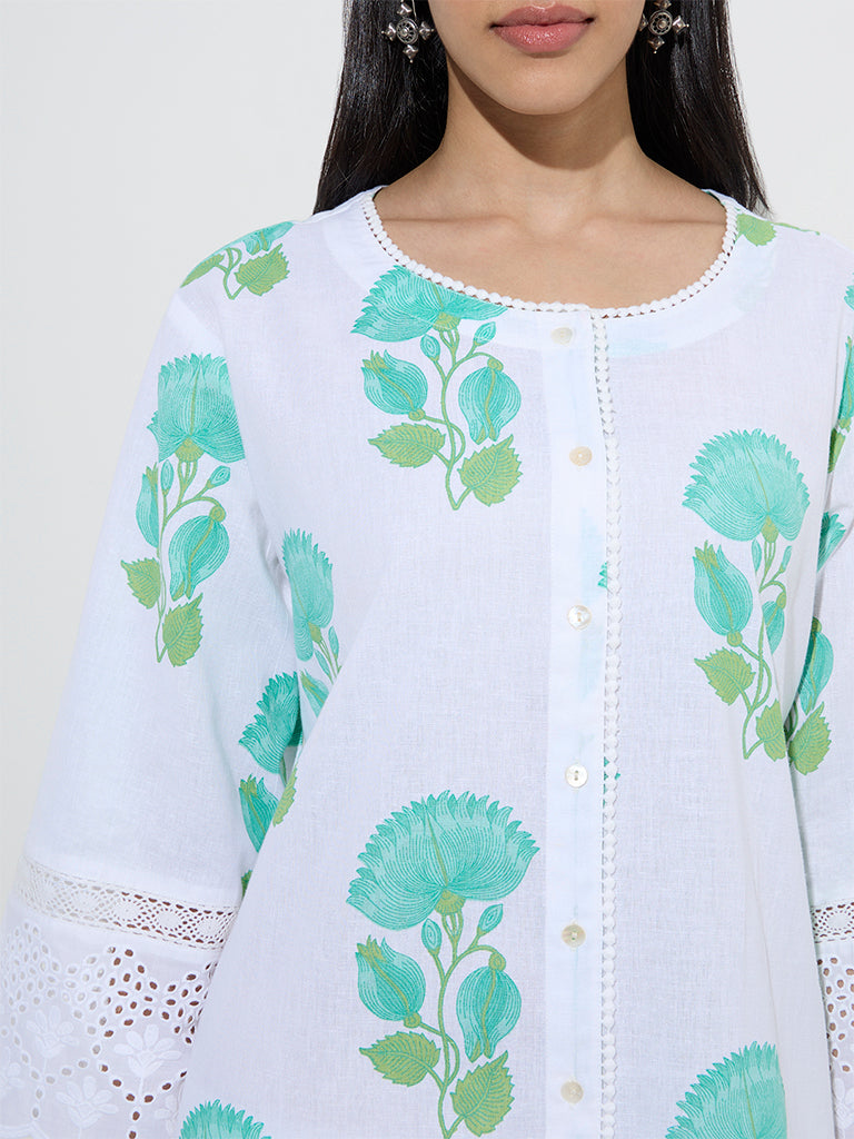 Utsa Aqua Floral Pattern A-Line Cotton-Blend Kurta
