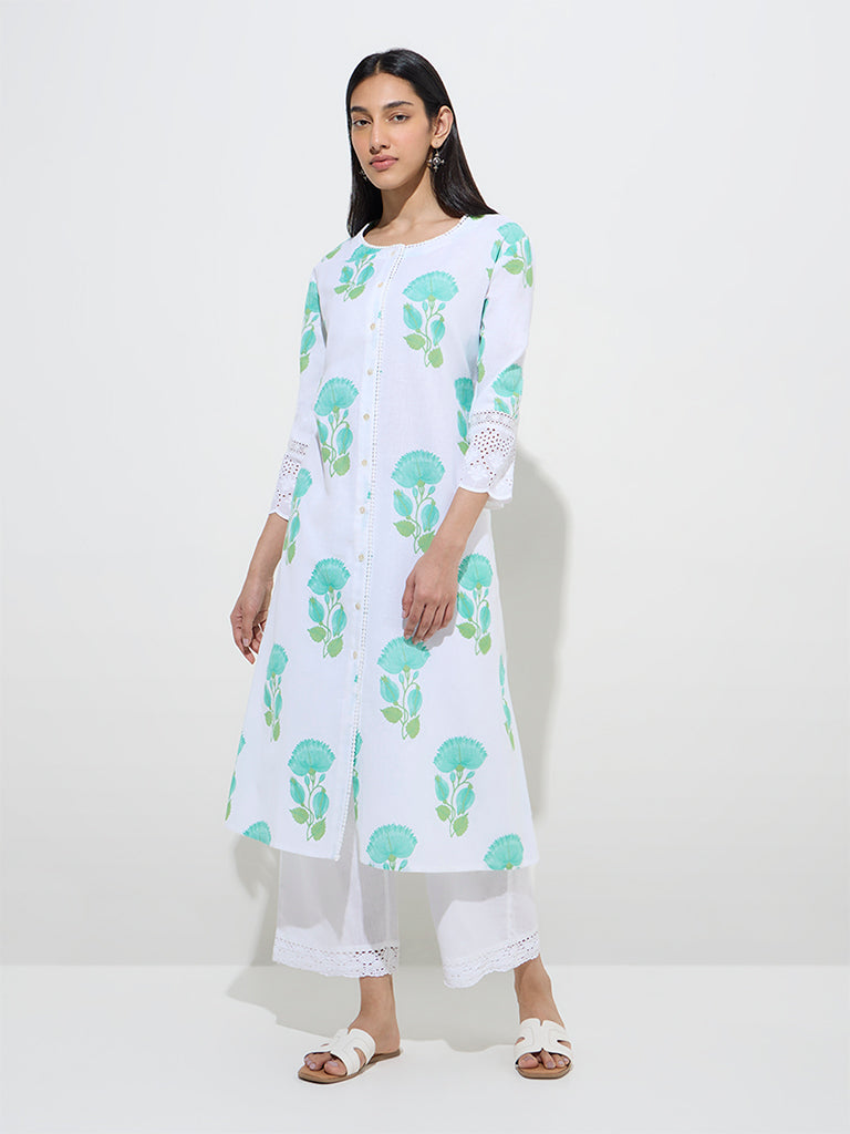 This aqua kurta from Utsa showcases vibrant floral designs on a flattering A-line silhouette. Crafted from a luxurious cotton-linen blend. it features a round neck. a button-up front. and three-quarter sleeves adorned with delicate schiffli detailing for an elegant finish.