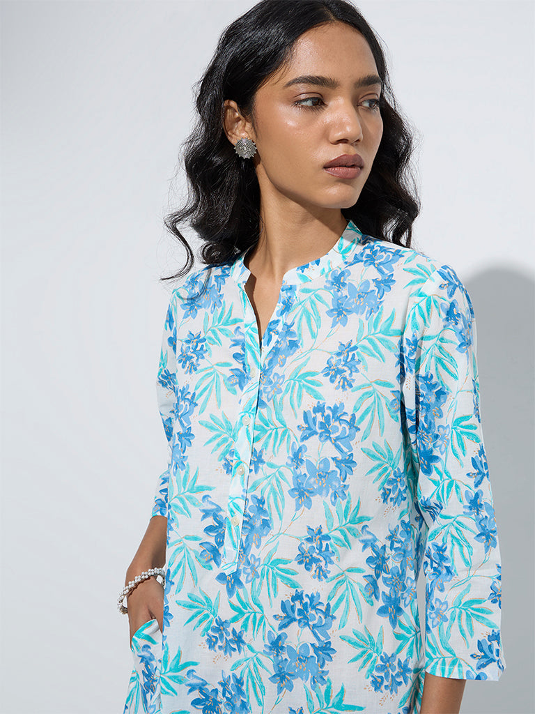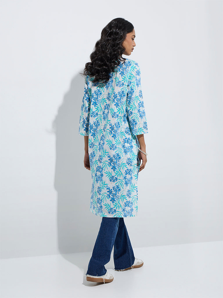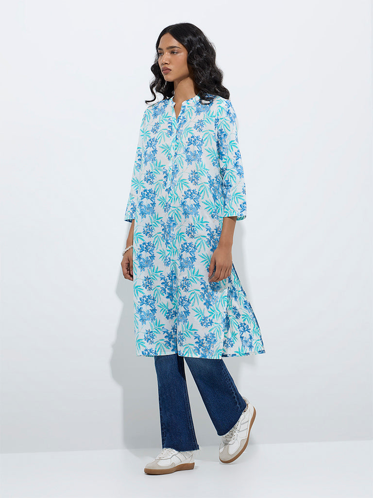 Utsa Aqua Foliage Printed Straight Cotton Kurta