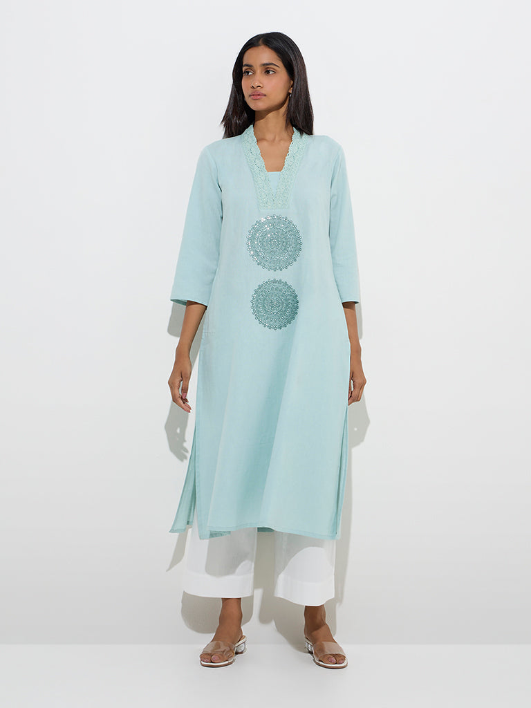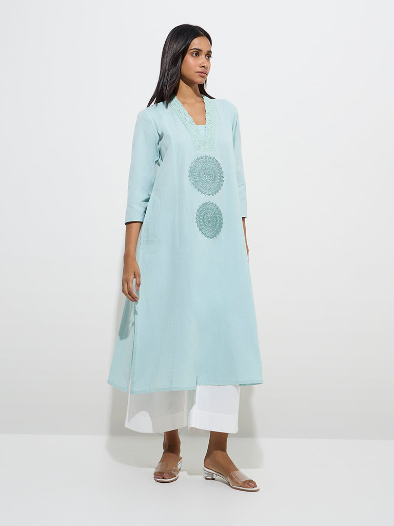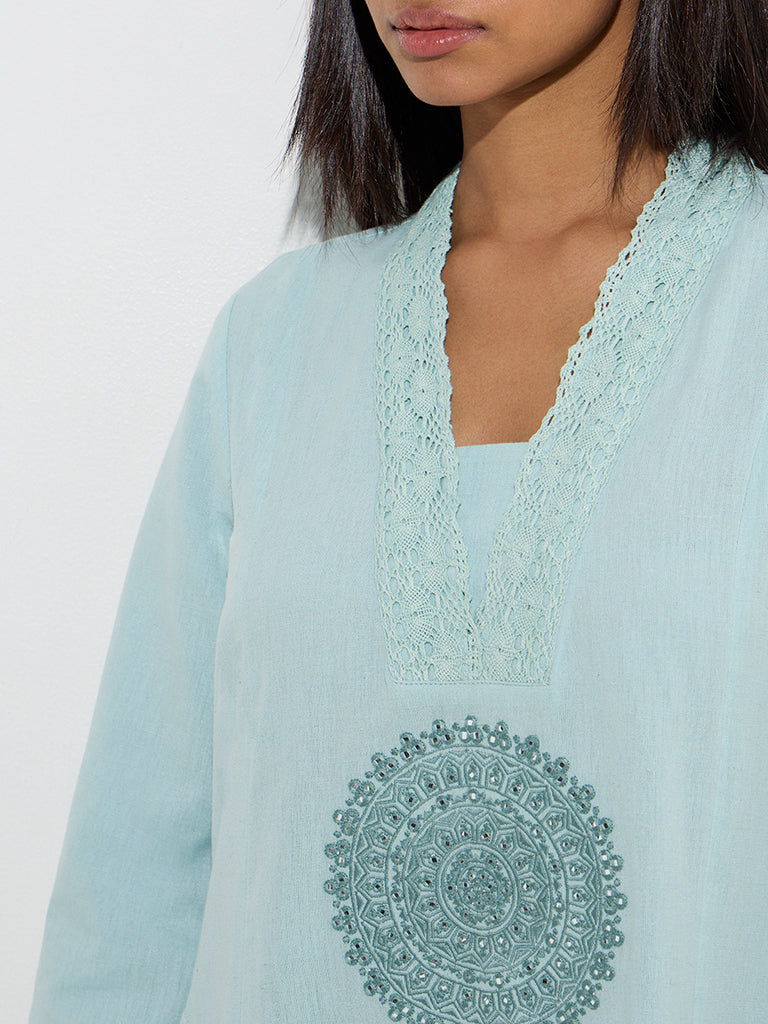 This aqua kurta from Utsa exudes elegance with its intricate mandala embroidery at the front. Crafted from a rich cotton-linen blend. the A-Line creation features a delicate crochet-detailed V-neck and three-quarter sleeves. The slip pocket renders practicality.
