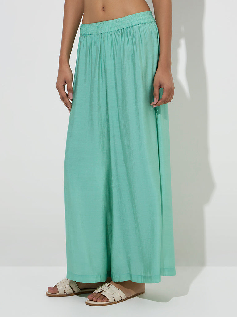 Utsa launches these aqua palazzos. tailored from an ultra-lightweight fabric that moves with ease. Designed for everyday comfort. they feature an elasticated waistband with attached drawstrings for a customizable fit.