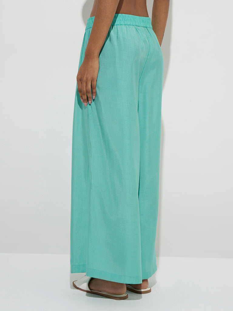 This pair of Aqua palazzos from Utsa is styled with a minimalistic charm. Milled from a lightweight fabric. they feature an elasticated waistband for a secure yet flexible fit.