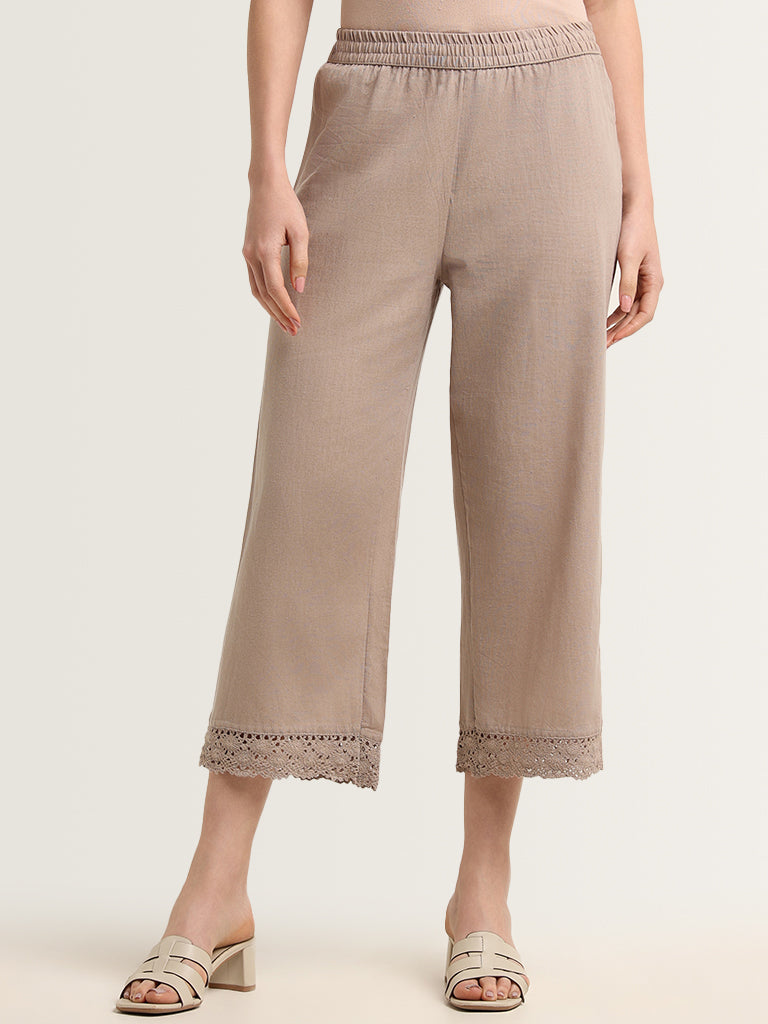 Utsa presents palazzos in beige exude sophistication. Its ankle-length design with lace insert and mid-rise waist ensure a flattering fit.