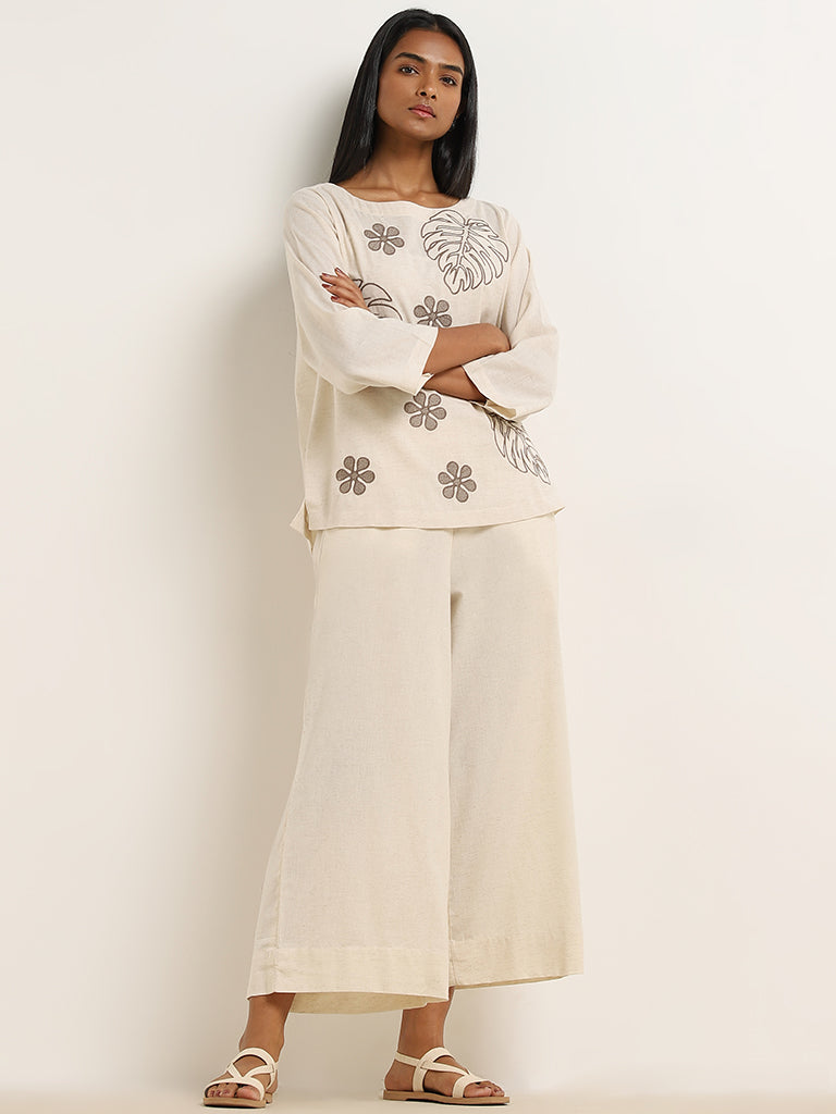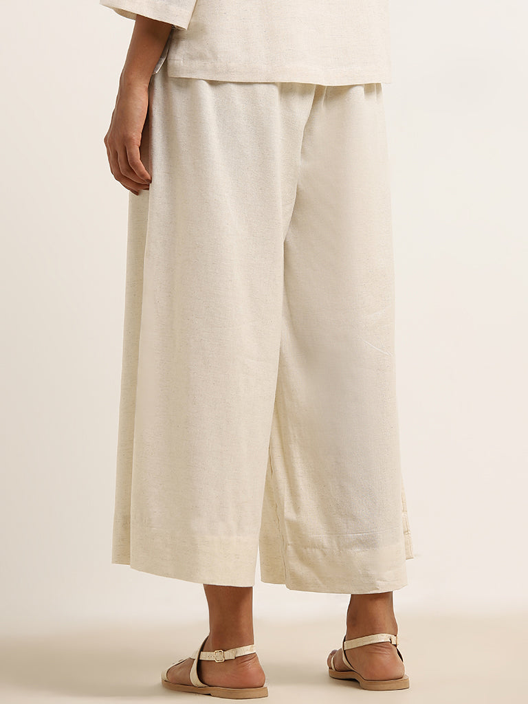 Utsa presents these beige flared palazzos with a high-rise fit. crafted from a cotton-blend fabric. They are designed with an elasticated waist and feature convenient side pockets.