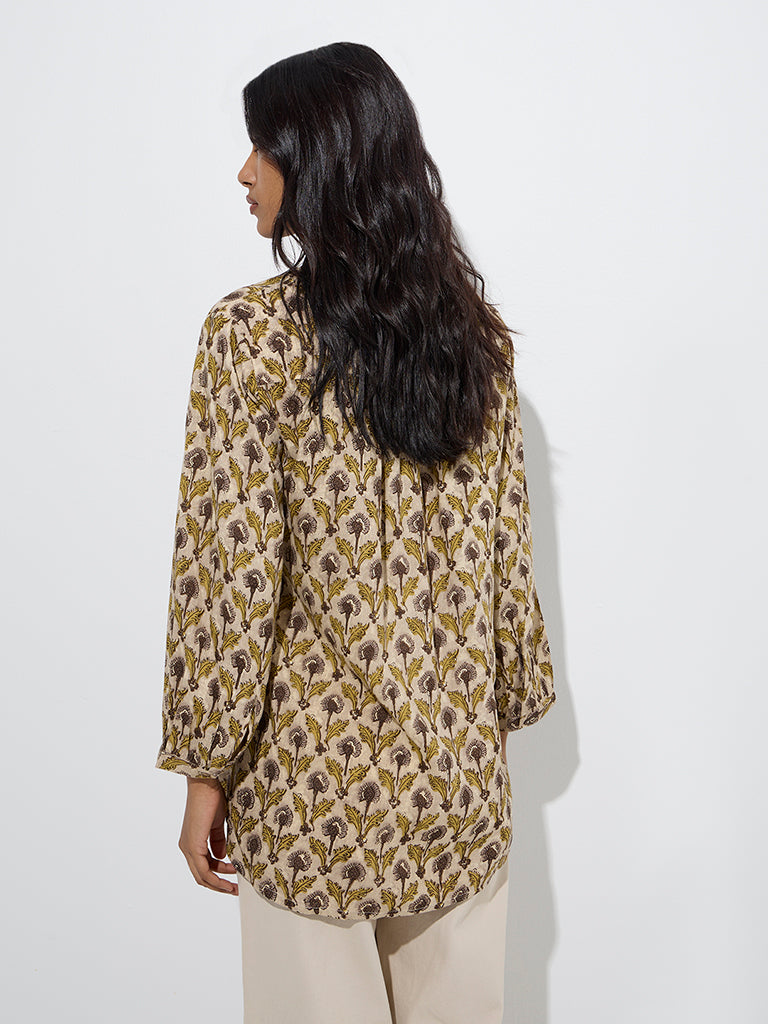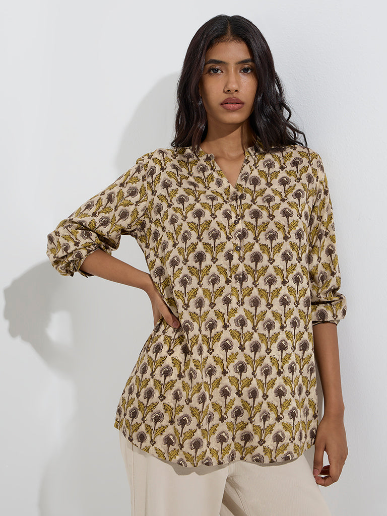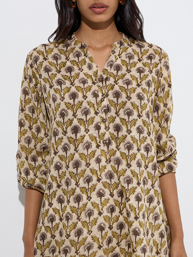 Utsa Beige Floral Design Cotton-Blend Tunic