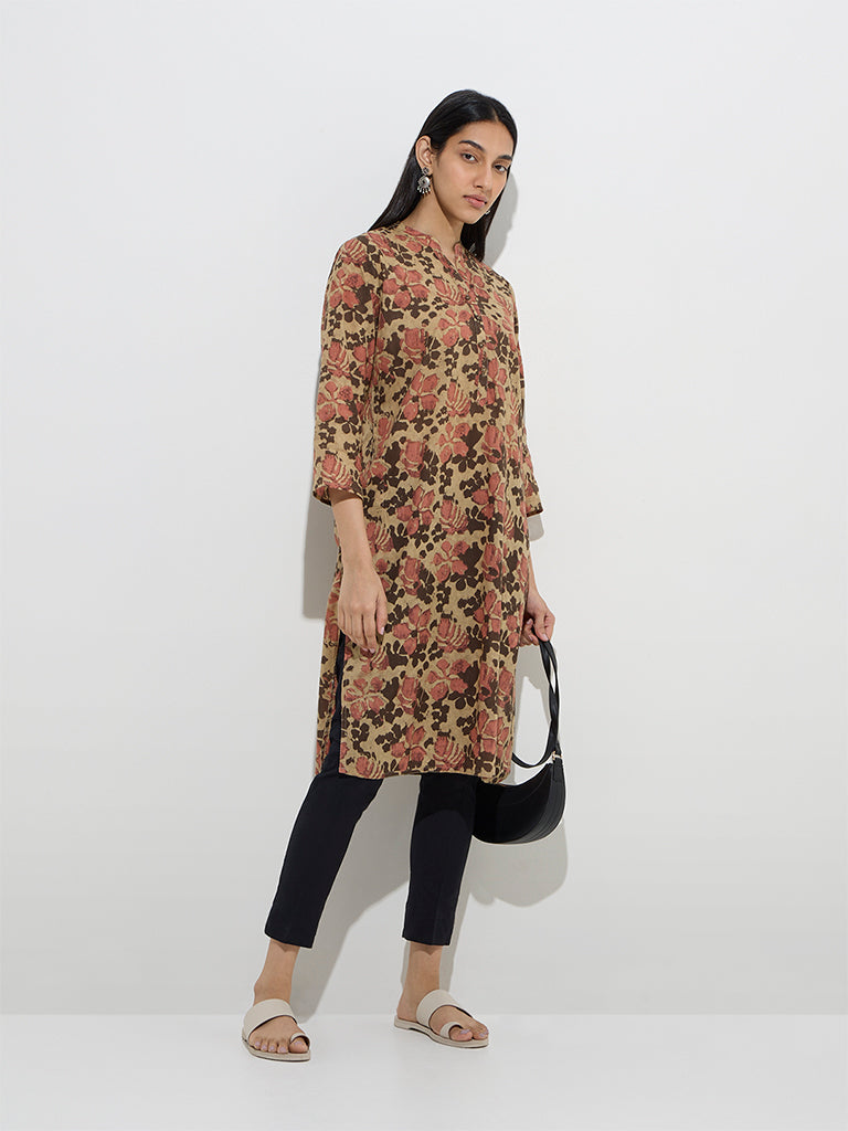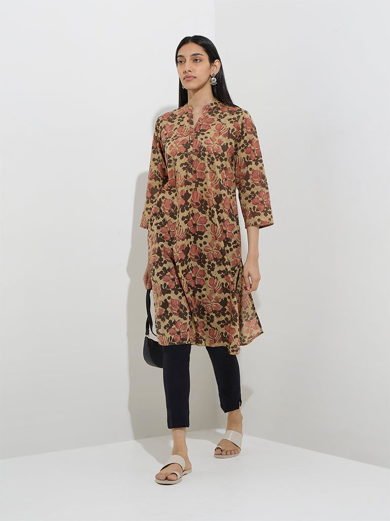 Utsa Beige Floral Design Straight Cotton Kurta