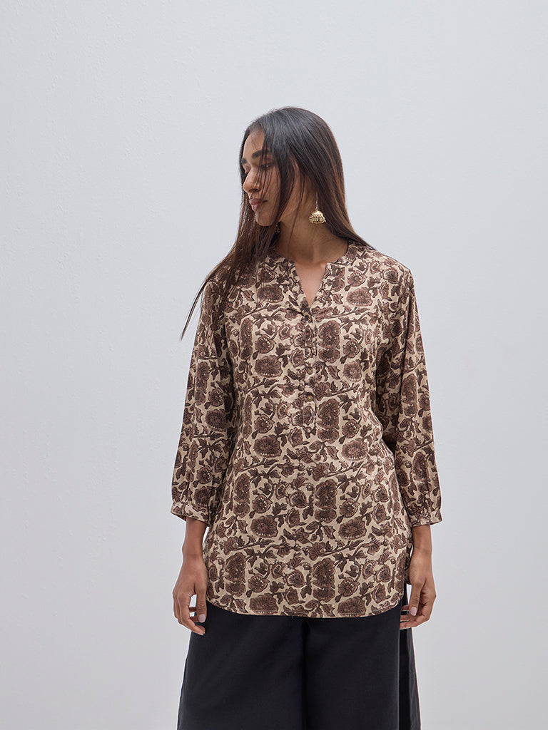 Utsa introduces this beige Kurti adorned with floral prints. Made from a lightweight material. the straight-fit creation is complemented by a notched neckline. button placket and three-quarter sleeves.