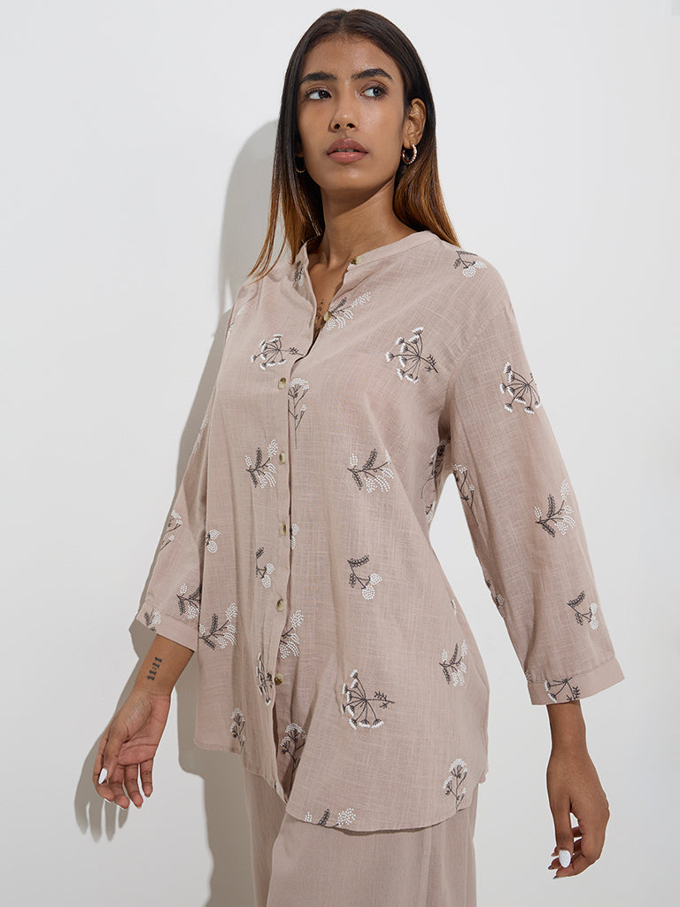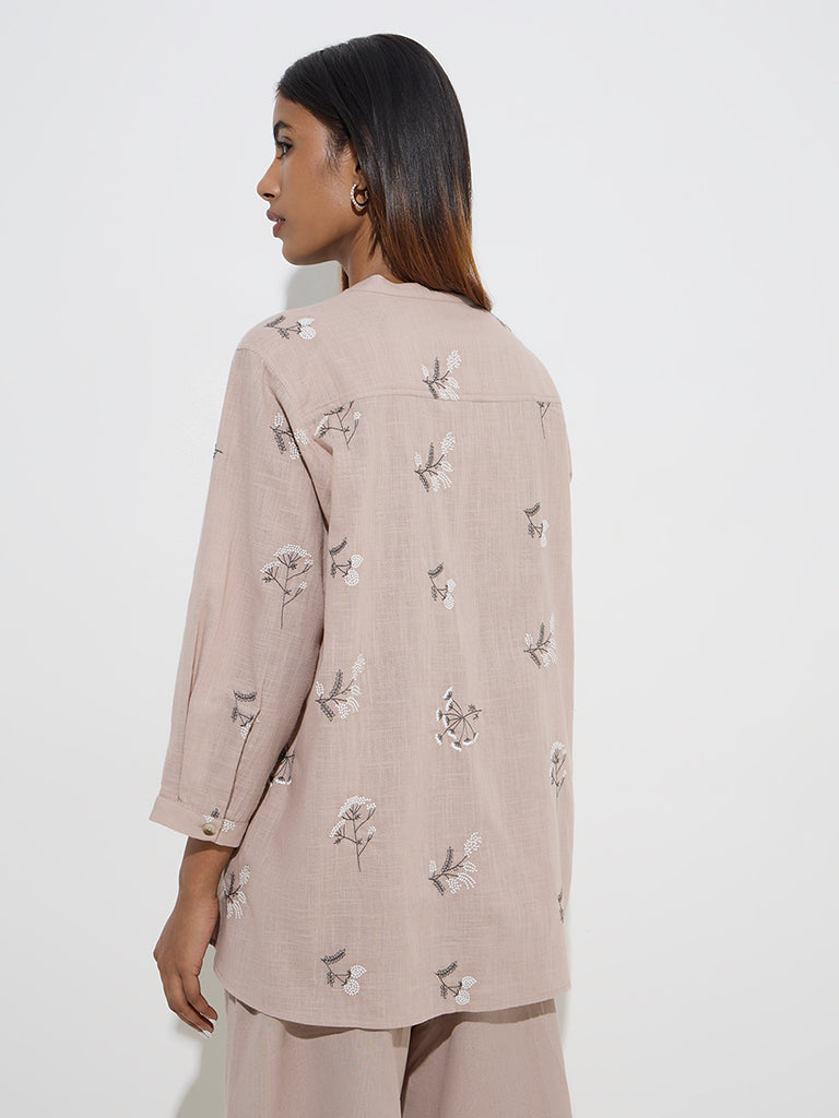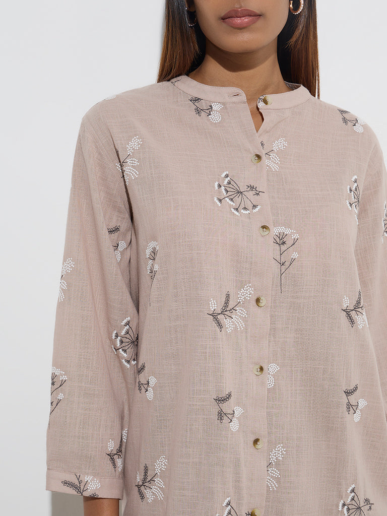 This beige kurti from Utsa is decorated with delicate floral embroidery for a graceful touch. Crafted from pure cotton. it features a structured mandarin collar. a button-up front. and full sleeves.